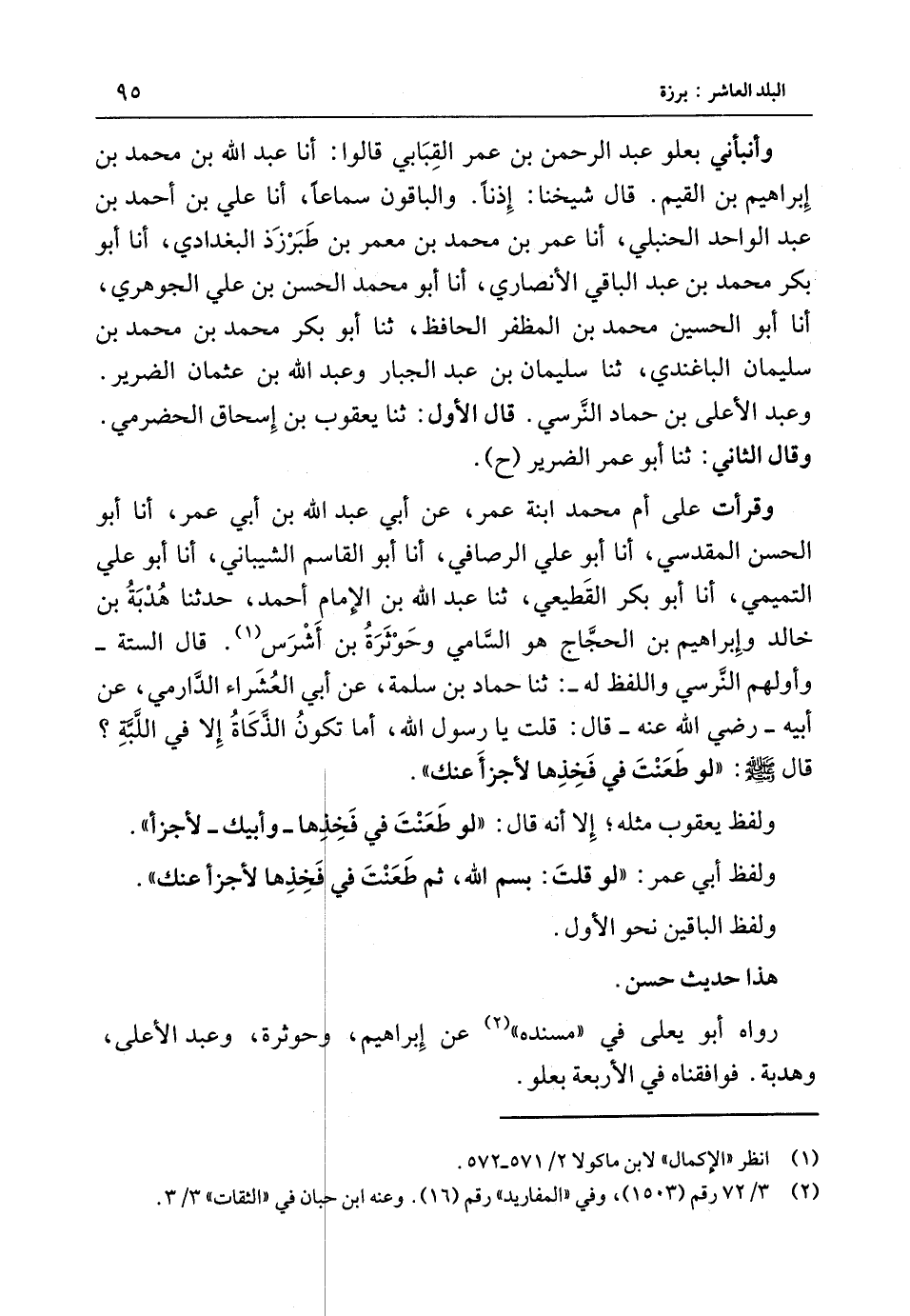 وَأَنْبَأَنِي بِعُلُوٍّ عَبْدُ الرَّحْمَنِ بْنُ عُمَرَ الْقِبَابِيُّ قَالُوا أَنا عَبْدُ اللَّهِ بْنُ مُحَمَّدِ بْنِ إِبْرَاهِيمَ بْنِ الْقَيِّمِ قَالَ شَيْخَنَا إِذْنًا وَالْبَاقُونَ سَمَاعًا أَنا عَلِيُّ بْنُ أَحْمَدَ بْنِ عَبْدِ الْوَاحِدِ الْحَنْبَلِيُّ أَنا عُمَرُ بْنُ مُحَمَّدِ بْنِ مَعْمَرِ بْنِ طَبَرْزَذَ الْبَغْدَادِيُّ أَنا أَبُوُ بَكْرٍ مُحَمَّدُ بْنُ عَبْدِ الْبَاقِي الأَنْصَارِيُّ أَنا أَبُو مُحَمَّدٍ الْحَسَنُ بْنُ عَلِيٍّ الْجَوْهَرِيُّ أَنا أَبُو الْحُسَيْنِ مُحَمَّدُ بْن الْمُظَفَّرِ الْحَافِظِ ثَنَا أَبُو بَكْرٍ مُحَمَّدُ بْنُ مُحَمَّدِ بْنِ سُلَيْمَانَ الْبَاغَنْدِيُّ ثَنَا سُلَيْمَانُ بْنُ عَبْدِ الْجَبَّارِ وَعَبْدُ اللَّهِ بْنُ عُثْمَانَ الضَّرِيرُ وَعَبْدُ الأَعْلَى بْنُ حَمَّادٍ النَّرْسِيُّ قَالَ الأَوَّل ثَنَا يَعْقُوبُ بْنُ إِسْحَاقَ الْحَضْرِمِيُّ وَقَالَ الثَّانِي ثَنَا أَبُو عُمَرَ الضَّرِيرُ (ح) وَقَرَأْتُ عَلَى أُمِّ مُحَمَّدٍ ابْنَةِ عُمَرَ عَنْ أَبِي عَبْدِ اللَّهِ بْنِ أَبِي عُمَرَ أَنا أَبُو الْحَسَنِ الْمَقْدِسِيُّ أَنا أَبُو عَلِيٍّ الرُّصَافِيُّ أَنا أَبُو الْقَاسِمِ الشَّيْبَانِيُّ أَنا أَبُو عَلِيٍّ التَّمِيمِيُّ أَنا أَبُو بَكْرٍ الْقَطِيعِيُّ ثَنَا عَبْدُ اللَّهِ بْنُ الإِمَامِ أَحْمَدَ حَدَّثَنَا هُدْبَةُ بن خَالِد وَإِبْرَاهِيم بن الْحجَّاج هُوَ السَّامِي وَحَوْثَرَةُ بْنُ أَشْرَسَ قَالَ السِّتَّةُ - وأولهم النَّرْسِي وَاللَّفْظ لَهُ - ثَنَا حَمَّادُ بْنُ سَلَمَةَ عَنْ أَبِي الْعَشْرَاءِ الدَّارِمِيِّ عَنْ أَبِيهِ - رَضِيَ اللَّهُ عَنْهُ - قَالَ قُلْتُ يَا رَسُولَ اللَّهِ أَمَا تَكُونُ الذَّكَاةُ إِلا فِي اللَّبَّةِ قَالَ {صَلَّى اللَّهُ عَلَيْهِ وَسَلَّمَ} لَوْ طَعَنْتَ فِي فَخِذِهَا لأَجْزَأَ عَنْكَ وَلَفْظُ يَعْقُوبَ مِثْلُهُ إِلا أَنَّهُ قَالَ لَوْ طَعَنْتَ فِي فَخِذِهَا - وَأَبِيكَ - لأَجْزَأَ وَلَفْظُ أَبِي عُمَرَ لَوْ قُلْتَ بِسْمِ اللَّهِ ثُمَّ طَعَنْتَ فِي فَخِذِهَا لأَجْزَأَ عَنْكَ وَلَفْظُ الْبَاقِينَ نَحْوُ الأَوَّلِ هَذَا حَدِيثٌ حَسَنٌ رَوَاهُ أَبُو يعلي فِي مُسْنده عَنْ إِبْرَاهِيم وحوثرة وَعبد الْأَعْلَى وهدبة فوافقناه فِي الْأَرْبَعَة بعلو