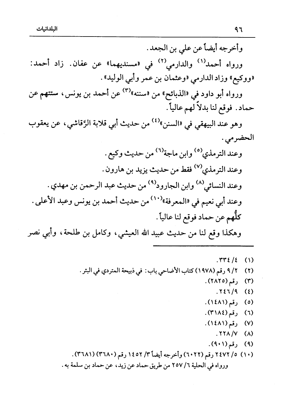 وَأخرجه أَيْضا عَنْ عَلِي بْن الْجَعْد وَرَوَاهُ أَحْمَد والدارمي فِي مسنديهما عَنْ عَفَّان زَاد أَحْمَد ووكيع وَزَاد الدَّارمِيّ وَعُثْمَان بْن عُمَر وَأبي الْوَلِيد وَرَوَاهُ أَبُو دَاوُد فِي الذَّبَائِح من سنَنه عَنْ أَحْمَد بْن يُونُس ستتهم عَنْ حَمَّاد فَوَقع لنا بَدَلا لَهُم عَالِيًا وَهُوَ عِنْدَ الْبَيْهَقِيّ فِي السّنَن من حَدِيث أَبِي قلَابَة الرقاشِي عَنْ يَعْقُوب الْحَضْرَمِيّ وَعند التِّرْمِذِي وَابْن ماجة من حَدِيث وَكِيع وَعند التِّرْمِذِي فَقَط من حَدِيث يَزِيد بْن هَارُون وَعند النَّسَائِيّ وَابْن الْجَارُود من حَدِيث عَبْد الرَّحْمَنِ بْن مهْدي وَعند أَبِي نعيم فِي الْمعرفَة من حَدِيث أَحْمَد بْن يُونُس وَعبد الْأَعْلَى كلهم عَنْ حَمَّاد فَوَقع لنا عَالِيًا وَهَكَذَا وَقع لنا من حَدِيث عُبَيْد اللَّهِ العيشي وكامل بْن طَلْحَة وَأبي نصر