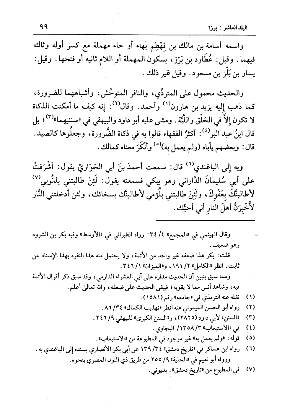 واسْمه أُسَامَة بْن مَالِك بْن قهطم بهاء أَوْ حاء مُهْملَة مَعَ كسر أَوله وثالثه فيهمَا وَقيل عُطَارِد بْن برز بِسُكُون الْمُهْملَة أَوِ اللَّام ثَانِيه أَوْ فتحهَا وَقيل يسَار بْن بلز بْن مَسْعُود وَقيل غَيْر ذَلِكَ والحَدِيث مَحْمُول عَلَى المتردي والنافر المتوحش وأشباههما للضَّرُورَة كَمَا ذهب إِلَيْهِ يَزِيد بْن هَارُون وَأَحْمَد وَقَالَ إِنَّه كَيْفَ مَا أمكنت الذَّكَاة لَا تكون إِلَّا فِي الْحلق واللبة وَمَشى عَلَيْهِ أَبُو دَاوُد وَالْبَيْهَقِيّ فِي سنَنَيْهِمَا بَل قَالَ ابْن عَبْد الْبر أَكْثَر الْفُقَهَاء قَالُوا بِهِ فِي ذَكَاة الضَّرُورَة وجعلوها كالصيد قَالَ وَبَعْضهمْ يأباه (وَلَمْ يعْمل بِهِ) وَأنكر مَعْنَاهُ كمالك وَبِهِ إِلَى الْبَاغَنْدِي قَالَ سَمِعت أَحْمَد بْن أَبِي الْحوَاري يَقُول أشرفت عَلَى أَبِي سُلَيْمَان الدَّارَانِي وَهُوَ يبكي فَسَمعته يَقُول لَئِن طالبتني بذنوبي لأطالبنك بعفوك وَلَئِن طالبتني بلؤمي لأطالبنك بسخائك وَلَئِن أدخلتني النَّار لأخبرن أهل النَّار أَنِّي أحبك