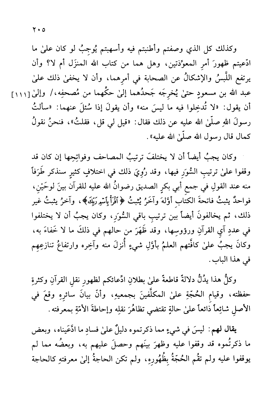 وقفوا على ترتيبِ السُّوَرِ فيها، وقد رُوِيَ ذلك في اختلافٍ كثير سنذكر طَرَفاً منه عند القولِ في جمعِ أبي بكرٍ الصديق رضوانُ الله عليه للقرآن بينَ لوحَيْنِ، فواحدٌ يثبتُ فاتحةَ الكتابِ أوَّلهَ وآخَرُ يثبتُ (اقْرَأْ بِاسْمِ رَبِّكَ) ، وآخرُ يثبتُ غير ذلك، ثم يخالفونَ أيضا بين ترتيبِ باقي السُّوَرِ، وكان يجبُ أن لا يختلفوا في عددِ آيِ القرآنِ ورؤوسِها، وقد ظَهَرَ من حالهم في ذلكَ ما لا خَفاءَ به.