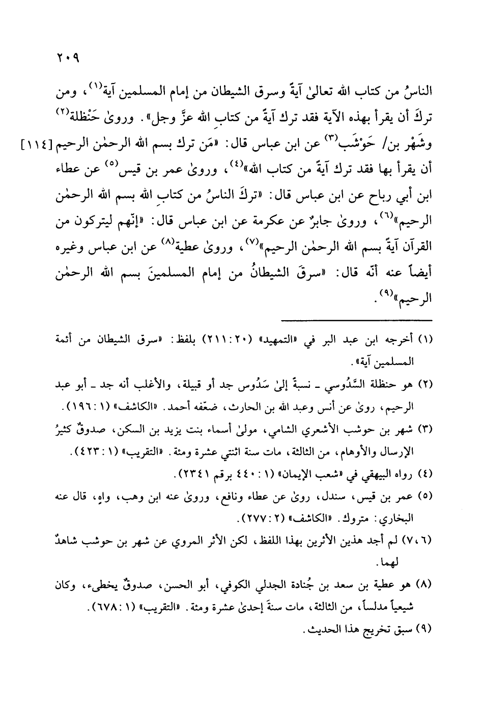وروى عطية عن ابن عباس وغيره أيضاً عنه أنّه قال: "سرقَ الشيطانُ من إمام المسلمينَ بِسْمِ اللَّهِ الرَّحْمَنِ الرَّحِيمِ ".