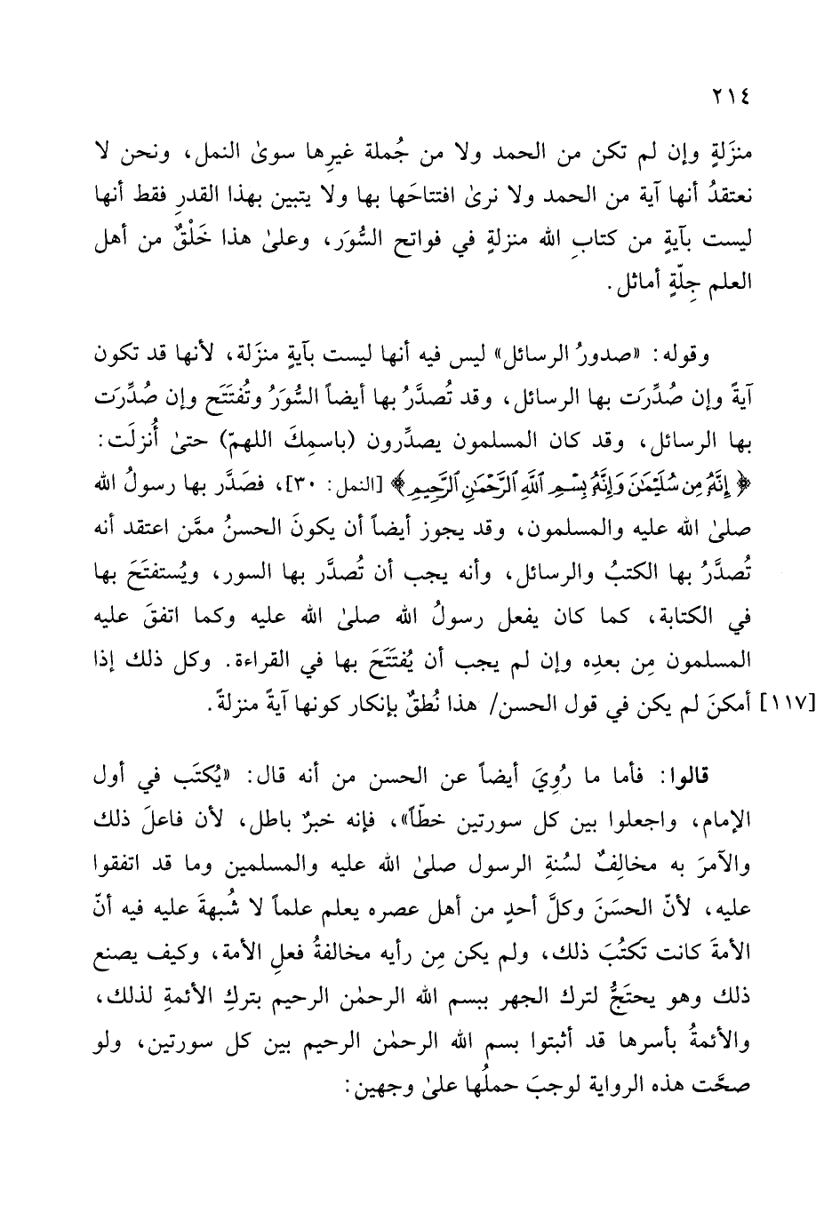 فصَدَّر بها رسولُ الله - صلى الله عليه وسلم - والمسلمون، وقد يجوز أيضاً أن يكونَ الحسنُ ممن اعتقد أنه تُصدَّرُ بها الكتبُ والرسائل، وأنه يجب أن تُصدر بها السور، ويُستفتَحَ بها في الكتابة، كما كان يفعل رسولُ الله - صلى الله عليه وسلم - وكما اتفقَ عليه المسلمون مِن بعدِه وإن لم يجب أن يُفتَتَحَ بها في القراءة.