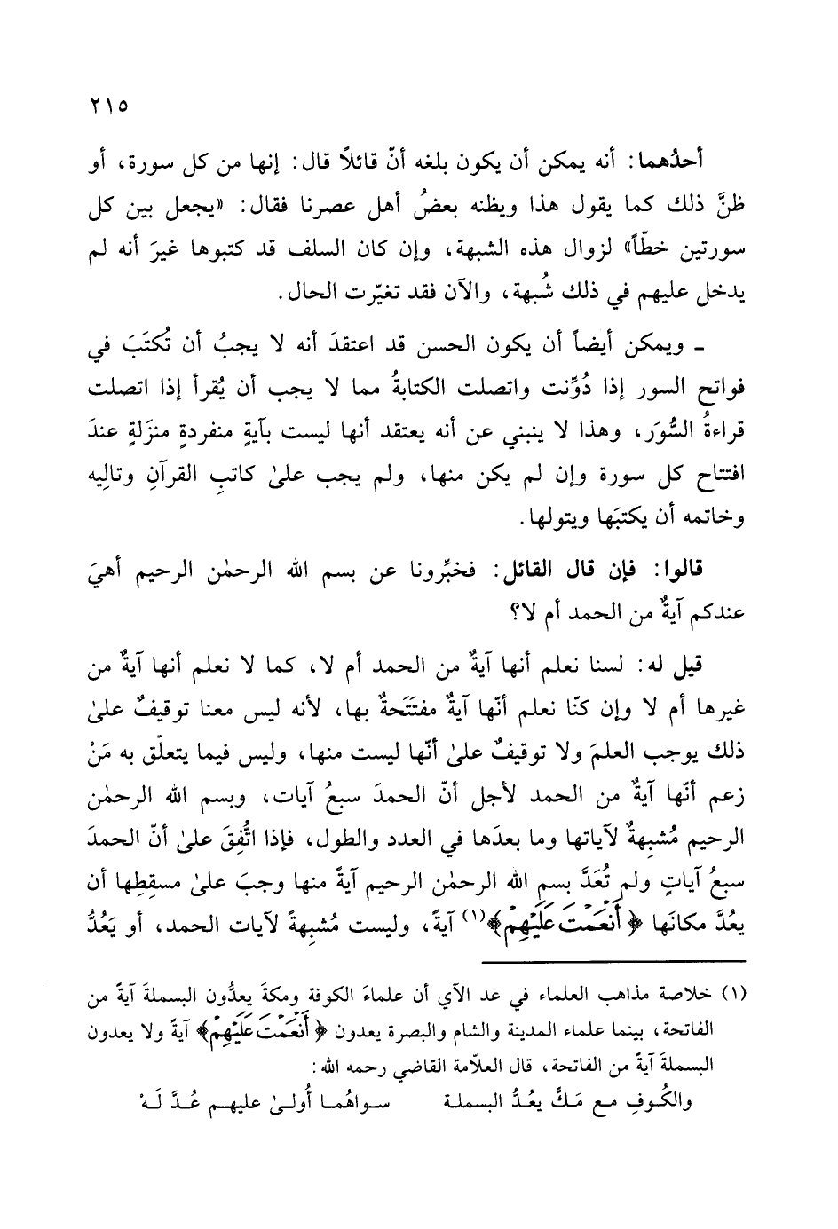 قراءةُ السُّوَر، وهذا لا ينبني عن أنه يعتقد أنها ليست بآيةٍ منفردةٍ منزَلةٍ عندَ