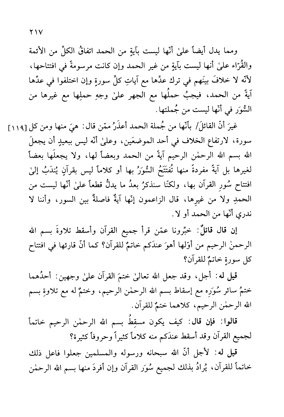 قال الزاعمون إنّها آية فاصلة بين السور، وأننا لا ندري أنّها من الحمد أو لا.