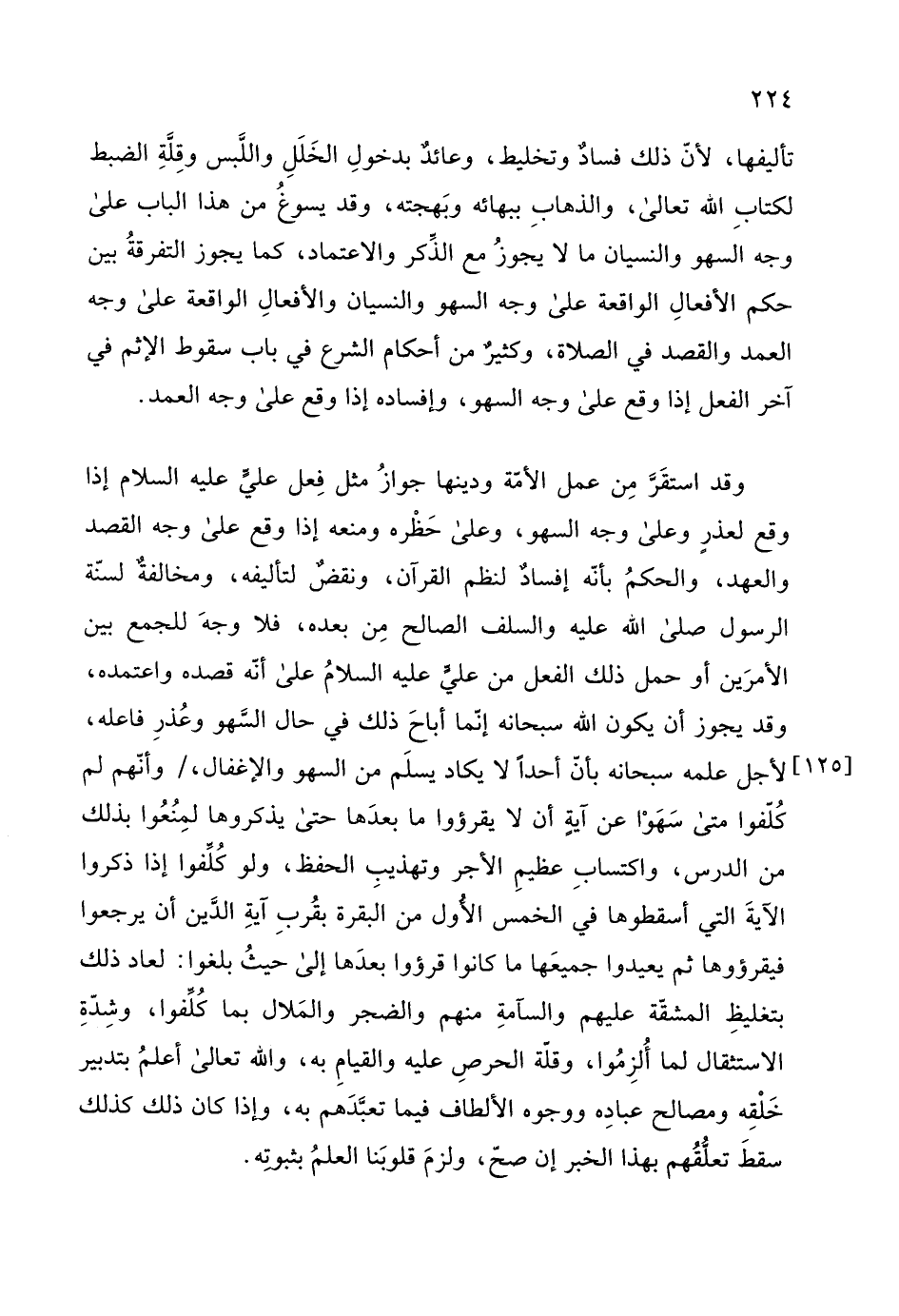 الرسول - صلى الله عليه وسلم - والسلف الصالح مِن بعده، فلا وجهَ للجمع بين الأمرَين أو حمل ذلك الفعل من على عليه السلامُ على أنّه قصده واعتمده، وقد يجوز أن يكون الله سبحانه إنّما أباحَ ذلك في حال السَّهو وعُذرِ فاعله، " لأجل علمه سبحانه بأن أحداً لا يكاد يسلَم من السهو والإغفال، وأنهم لمَّا كُلّفوا متى سَهَوْا عن آيةٍ أن لا يقرؤوا ما بعدَها حتى يذكروها لمِنُعُوا بذلك من الدرس، واكتسابِ عظيمِ الأجر وتهذيبِ الحفظ، ولو كُلِّفوا إذا ذكروا الآيةَ التي أسقطوها في الخمس الأول من البقرة بقُربِ آيةِ الدَّين أن يرجعوا فيقرؤوها ثم يعيدوا جميعَها ما كانوا قرؤوا بعدَها إلى حيثُ بلغوا: لعاد ذلك بتغليظِ المشقّة عليهم والسآمةِ منهم والضجر والمَلال بما كُلِّفوا، وشِدّةِ الاستثقال لما أُلزِمُوا، وقلة الحرصِ عليه والقيامِ به، والله تعالى أعلمُ بتدبير خَلْقِه ومصالح عبادِه ووجوه الألطاف فيما تعبَّدَهم به، وإذا كان ذلك كذلك سقطَ تعلُّقُهم بهذا الخبر إن صح، ولزمَ قلوبَنا العلمُ بثبوته.