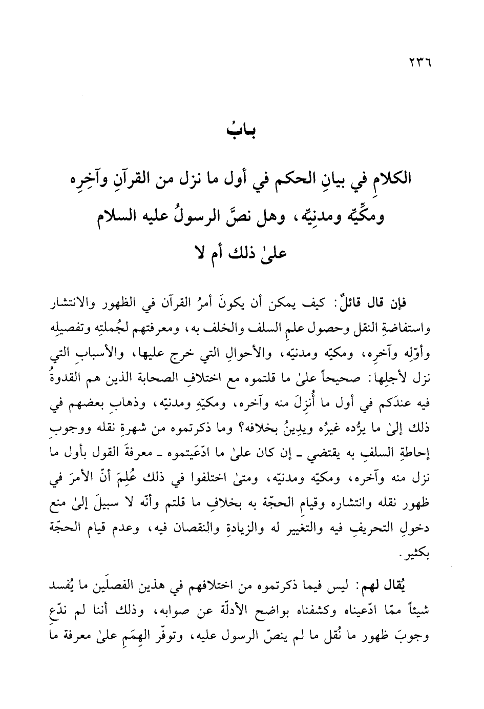 واستفاضةِ النقل وحصول علمِ السلف والخلف به، ومعرفتهم لجُملتِه وتفصيلِه وأوّلِه وآخرِه، ومكيّه ومدنيّه، والأحوالِ التي خرج عليها، والأسبابِ التي نزل لأجلِها: صحيحاً على ما قلتموه مع اختلافِ الصحابة الذين هم القدوةُ فيه عندَكم في أول ما أُنزِلَ منه وآخره، ومكيهِ ومدنيّه، وذهابِ بعضهم في ذلك إلى ما يزُده غيرُه ويدِينُ بخلافه، وما ذكرتموه من شهرةِ نقله ووجوبِ إحاطةِ السلفِ به يقتضي - إن كان على ما ادعَيتموه - معرفةَ القول بأول ما نزل منه وآخره، ومكيه ومدنيه، ومتى اختلفوا في ذلك عُلِمَ أنّ الأمرَ في ظهور نقله وانتشاره وقيامِ الحجَّة به بخلافِ ما قلتم وأنه لا سبيلَ إلى منع دخولِ التحريفِ فيه والتغيير له والزيادةِ والنقصان فيه، وعدم قيام الحجّة بكثير.