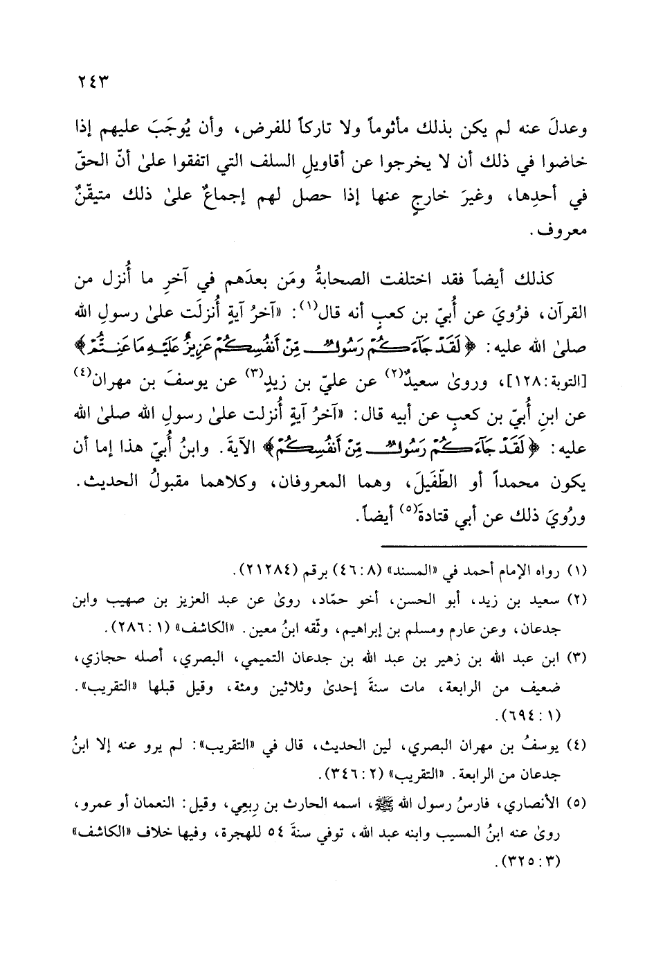 عن ابنِ أُبى بن كعبِ عن أبيه قال: "آخرُ آيةٍ أُنزلت على رسولِ الله صلى الله عليه: (لَقَدْ جَاءَكُمْ رَسُولٌ مِنْ أَنْفُسِكُمْ عَزِيزٌ عَلَيْهِ مَا عَنِتُّمْ) الآية َ.