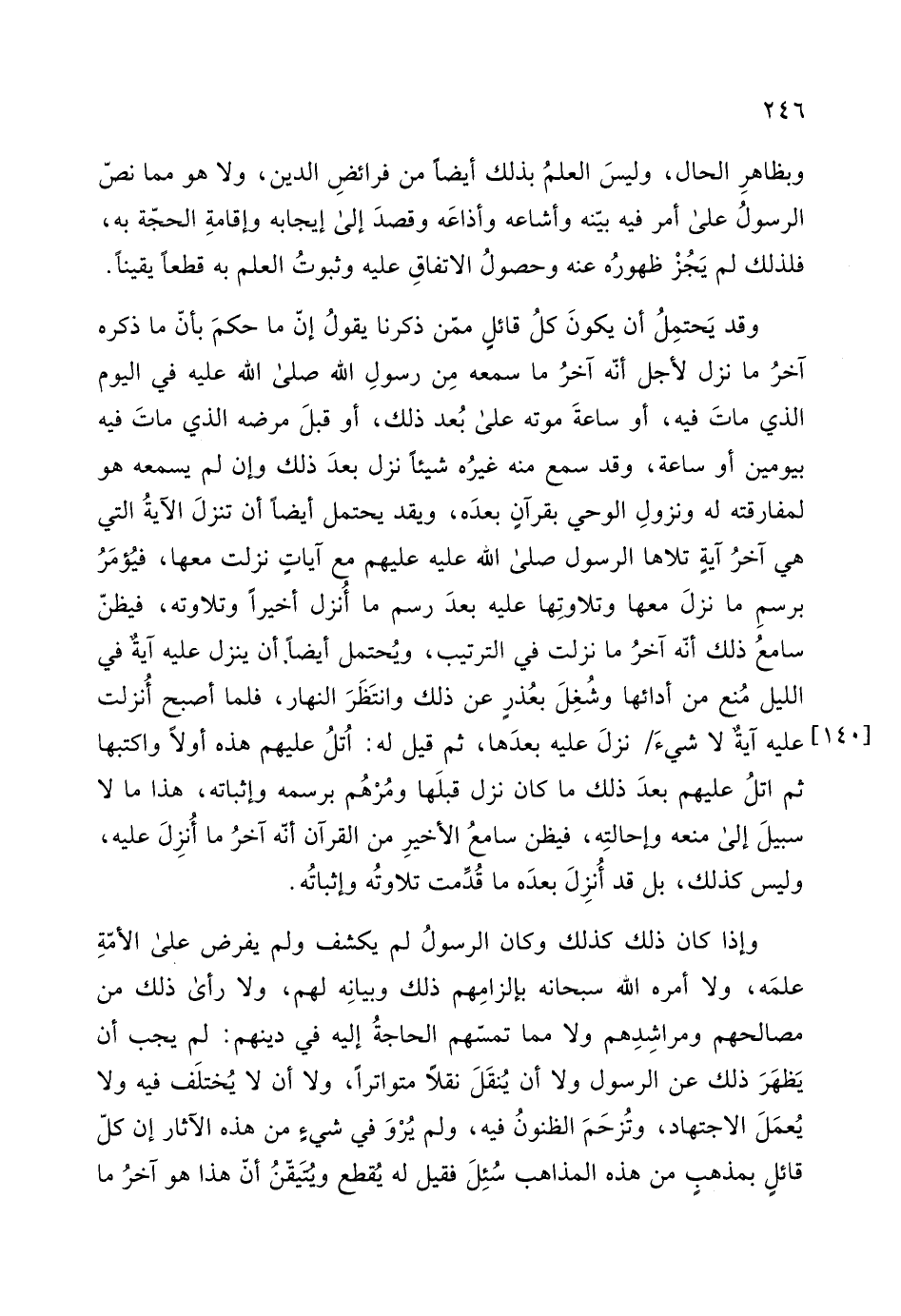 آخرُ ما نزل لأجل أنّه اَخرُ ما سمعه مِن رسولِ الله - صلى الله عليه وسلم - في اليوم الذي ماتَ فيه، أو ساعةَ موته على بُعد ذلك، أو قبلَ مرضه الذي ماتَ فيه بيومين أو ساعة، وقد سمع منه غيرُه شيئاً نزل بعدَ ذلك وإن لم يسمعه هو لمفارقته له ونزولِ الوحي بقرآنٍ بعدَه، ويقد يحتمل أيضاً أن تنزلَ الآية ُ التي هي آخرُ آيةٍ تلاها الرسول - صلى الله عليه وسلم - عليهم مع آياتٍ نزلت معها، فيُؤمَرُ برسمِ ما نزلَ معها وتلاوتِها عليه بعدَ رسم ما أُنزل أخيرأ وتلاوته، فيظنّ سامعُ ذلك أنه اَخرُ ما نزلت في الترتيب، ويُحتمل أيضا أن ينزل عليه آية في الليل مُنع من أدائها وشُغِلَ بعُذرٍ عن ذلك وانتَظَرَ النهار، فلما أصبح أُنزلت عليه آية لا شيءَ نزلَ عليه بعدَها، ثم قيل له: اُتلُ عليهم هذه أولاً واكتبها ثم اتلُ عليهم بعدَ ذلك ما كان نزل قبلَها ومُرْهُم برسمه وإثباته، هذا ما لا سبيلَ إلى منعه وإحالتِه، فيظن سامعُ الأخيرِ من القرآن أنه آخرُ ما أُنزِلَ عليه، وليس كذلك، بل قد أُنزِلَ بعدَه ما قُدِّمت تلاوتُه وإثباتُه.