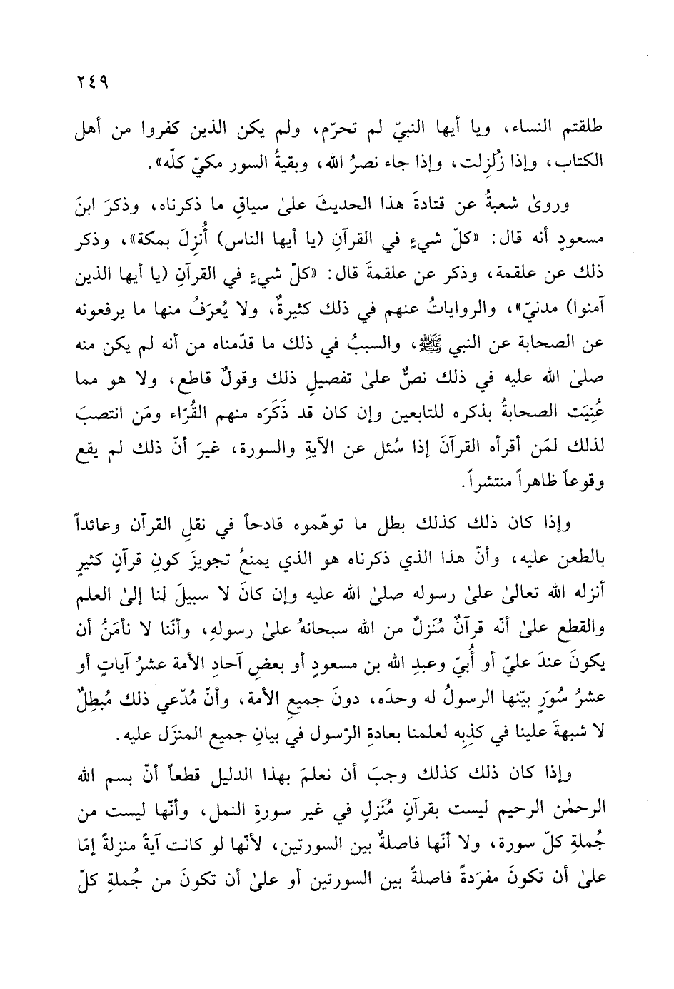 يكونَ عندَ عليّ أو أُبيّ وعبدِ الله بن مسعود أو بعضِ آحادِ الأمة عشرُ اَياتٍ أو عشرُ سُوَرٍ بيّنها الرسولُ له وحدَه، دونَ جميعِ الأمة، وأنّ مُدّعي ذلك مُبطِل لا شبهةَ علينا في كذِبِه لعلمنا بعادةِ الرّسول في بيانِ جميع ال منزَل عليه.