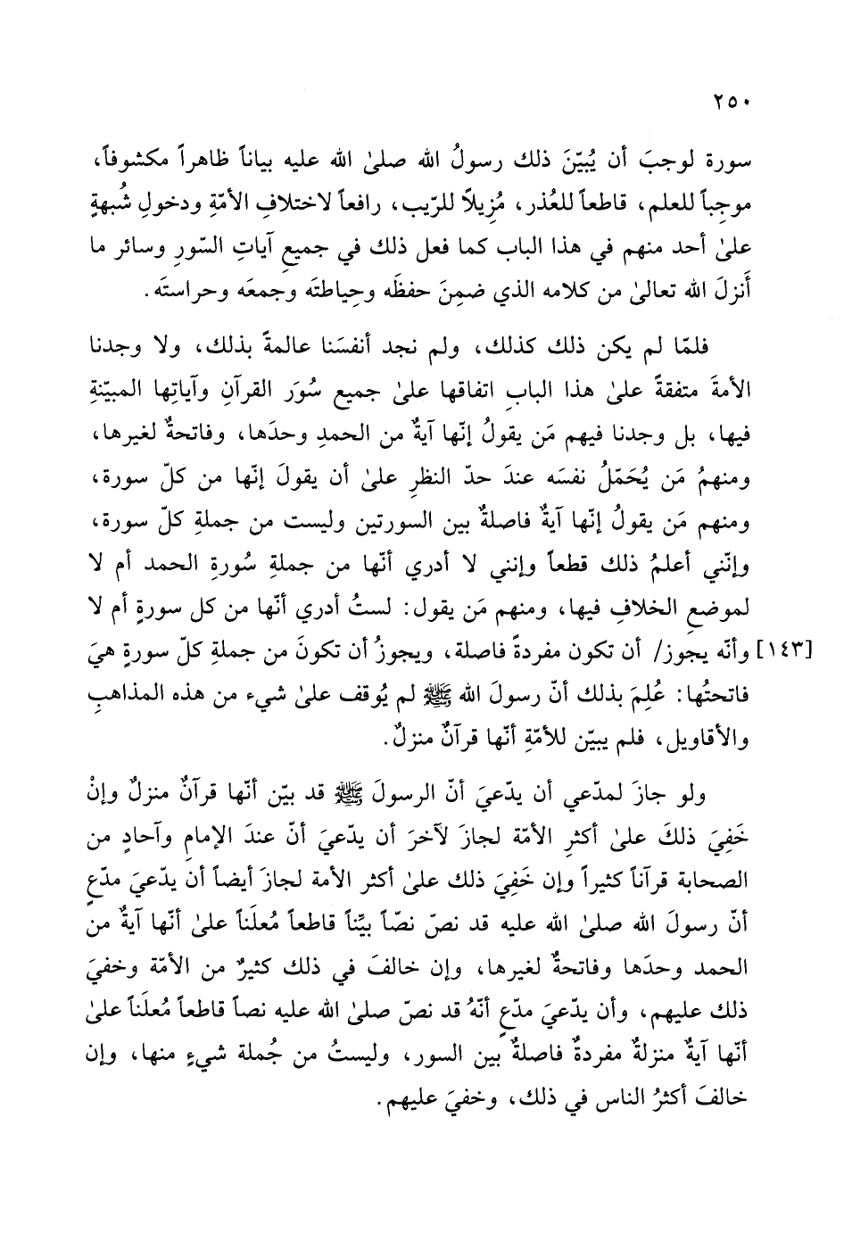 ولو جازَ لمدّعي أن يدعيَ أنّ الرسولَ - صلى الله عليه وسلم - قد بيّن أنها قرآن منزل وإنْ خَفِيَ ذلكَ على أكثرِ الأمّة لجازَ لآخرَ أن يدّعيَ أنّ عندَ الإمامِ وآحادٍ من الصحابة قرآناً كثيراً وإن خَفِيَ ذلك على أكثر الأمة لجازَ أيضاً أن يدّعيَ مدعٍ أن رسولَ الله - صلى الله عليه وسلم - قد نصَّ نصّاً بيِّناً قاطعاً مُعلَناً على أنها آية من الحمد وحدَها وفاتحةٌ لغيرها، وإن خالفَ في ذلك كثيرٌ من الأمّة وخفيَ ذلك عليهم، وأن يدعيَ مدّعٍ أنهُ قد نصَّ - صلى الله عليه وسلم - نصاً قاطعاً مُعلَناً على أنّها آية منزلة مفردة فاصلة بين السور، وليستُ من جُملة شيءٍ منها، وإن خالفَ أكثرُ الناس في ذلك، وخفيَ عليهم.