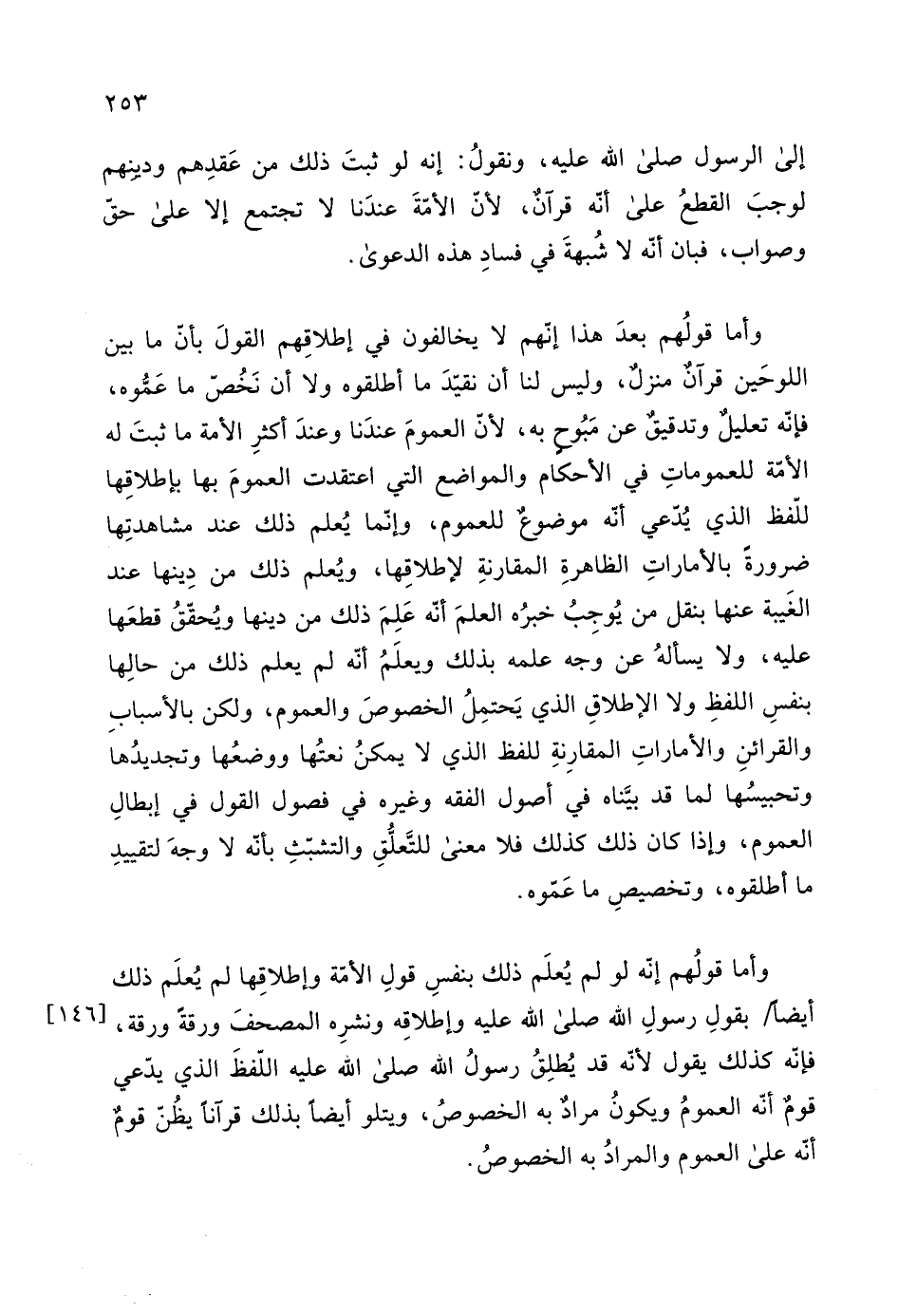 إلى الرسول - صلى الله عليه وسلم -، ونقولُ: إنه لو ثبتَ ذلك من عَقدِهم ودينهم لوجبَ القطعُ على أنه قرآنٌ، لأن الأمّةَ عندَنا لا تجتمع إلا على حقّ وصواب، فبان أنّه لا شُبهةَ في فسادِ هذه الدعوى.