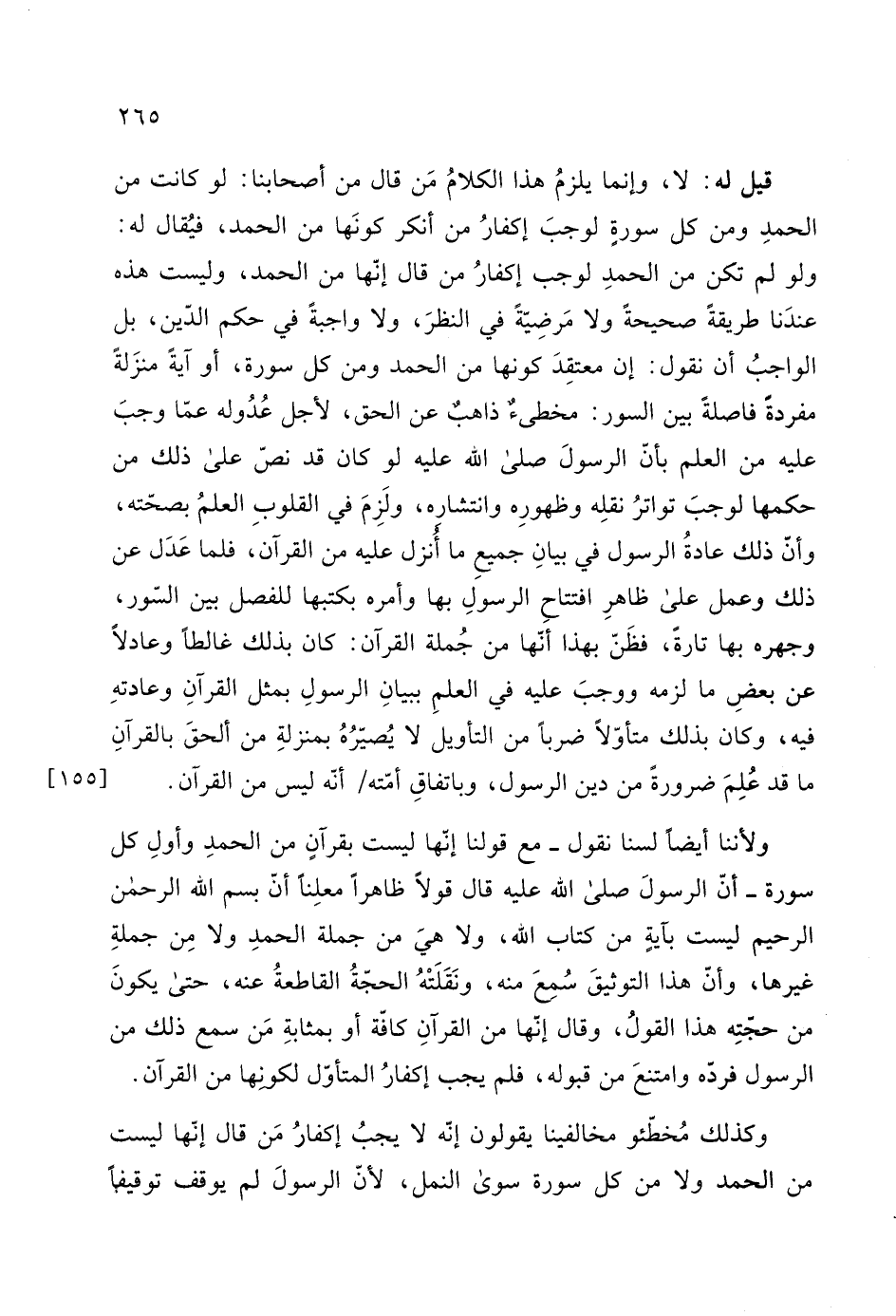 سورة - أنّ الرسولَ - صلى الله عليه وسلم - قال قولا ظاهرا معلِنا أنّ بسم الله الرحمن الرحيم ليست بآيةٍ من كتاب الله، ولا هى من جملة الحمدِ ولا مِن جملةِ غيرها، وأنّ هذا التوثيقَ سُمِعَ منه، ونَقَلَتْهُ الحجَّة ُ القاطعةُ عنه، حتى يكون من حجتِه هذا القولُ، وقال إنها من القرآنِ كافة أو بمثابةِ مَن سمع ذلك من الرسول فرده وامتنعَ من قبوله، فلم يجب إكفارُ المتأوِّل لكونها من القرآن.