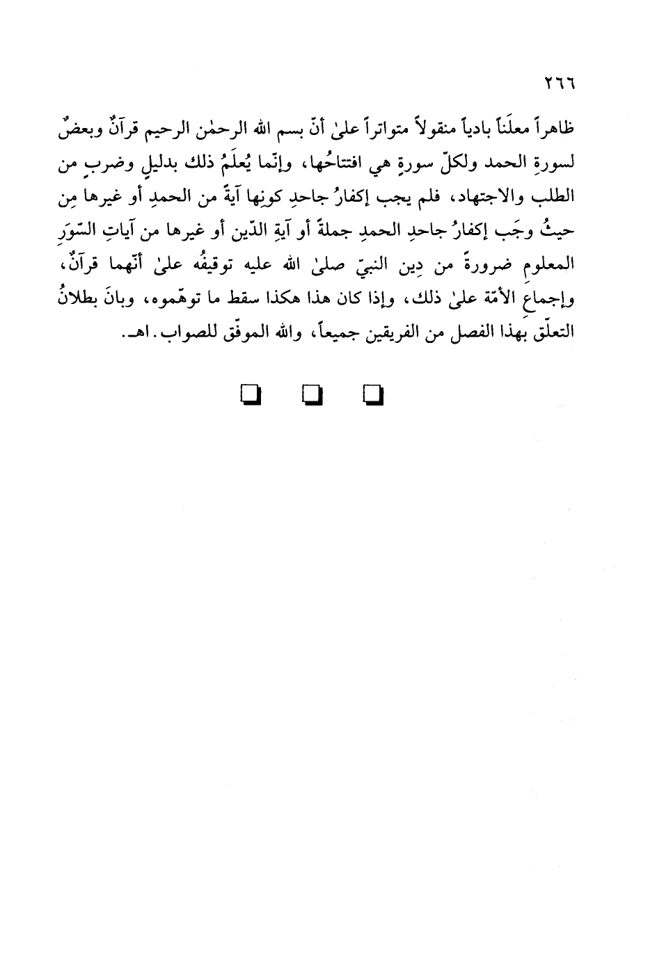 ظاهرا معلَنا بادياً منقولا متواترا على أن بِسْمِ اللَّهِ الرَّحْمَنِ الرَّحِيمِ قرآن وبعضٌ لسورةِ الحمد ولكل سورةٍ هي افتتاحُها، وإنما يُعلَمُ ذلك بدليلٍ وضربٍ من الطلب والاجتهاد، فلم يجب إكفارُ جاحدِ كونها آيةً من الحمدِ أو غيرها مِن حيثُ وجَب إكفارُ جاحدِ الحمدِ جملةً أو آيةِ الدين أو غيرها من آياتِ السوَرِ المعلومِ ضرورةً من دِين النبى - صلى الله عليه وسلم - توقيفُه على أنهما قرآنٌ.