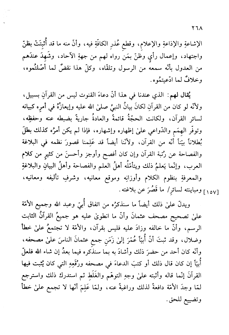 ولأنه لو كان من القرآنِ لكانَ بيانُ النبيِّ - صلى الله عليه وسلم - وإيعازه في أمرِه كبيانه لسائر القرآن، ولكانت الحجَّة ُ قائمةً والعادةُ جاريةً بضبطه عنه وحفظِه، وتوفر الهِمَمِ والدّواعي على إظهاره وإشهاره، فإذا لم يكن أمرُه كذلك بطلَ بُطلانا بيناً أنّه من القرآن، ولأننا أيضاً قد عَلِمنا قصورَ نظمه في البلاغة والفصاحة عن رتبة القرآن وإن كان أفصح وأوجز وأحسنَ من كثيرِ من كلام العرب، وإنما يَعلمُ ذلك ويتأملُه أهلُ العلم والفصاحة وأهلُ البيانِ والبلاغةِ والمعرفةِ بنظوم الكلام وأوزانِه وموقع معانيه، وشرفِ تأليفه ومعانيه، ومباينته لسائرِ ما قَصُرَ عن بلاغته.