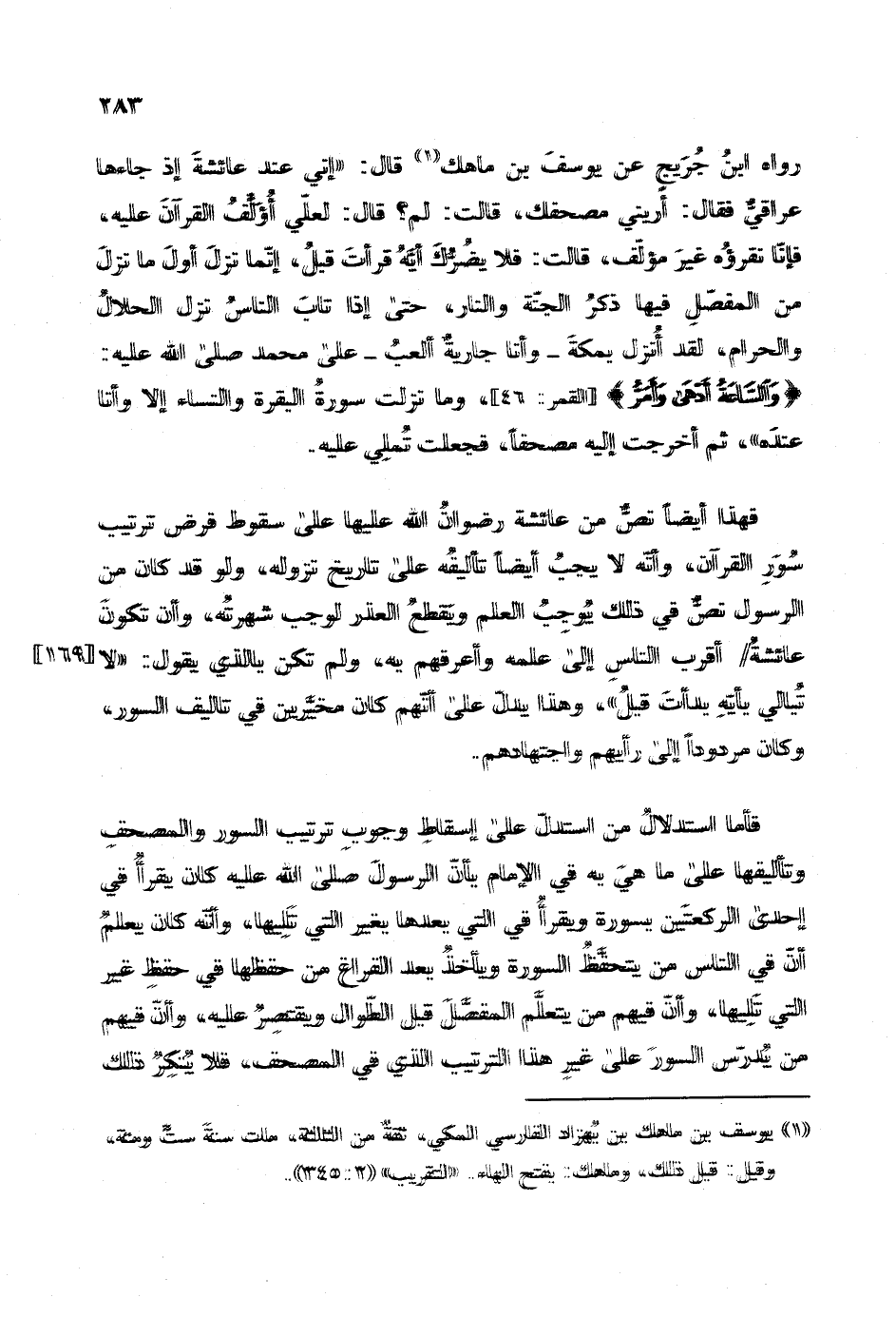 فهذا أيضا نص من عائشة - رضي الله عنها - على سقوط فرض ترتيب سور القرآن، وأنه لا يجب أيضا تأليفه على تاريخ نزوله، ولو قد كان من الرسول - صلى الله عليه وسلم - نص في ذلك يوجب العلم ويقطع العذر لوجب شهرته، وأن تكون عائشة أقرب الناس إلى علمه وأعرفهم به، ولم تكن بالذي يقول لا تبالي بأيه بدأت قبل"