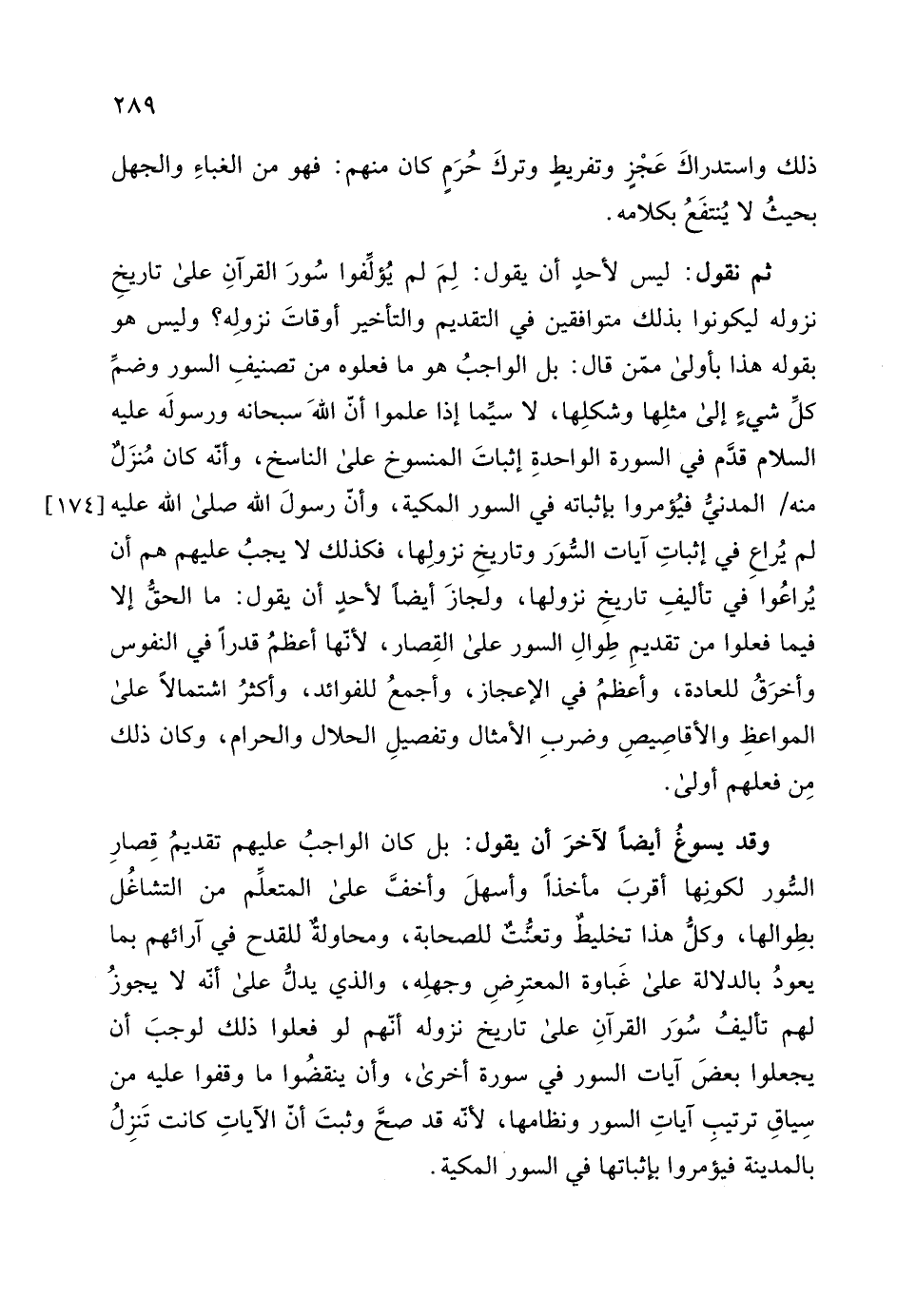 منه المدني فيُؤمروا بإثباته في السور المكية، وأن رسولَ الله - صلى الله عليه وسلم - لم يُراعِ في إثباتِ آيات السُّوَر وتاريخِ نزولِها، فكذلك لا يجبُ عليهم هم أن يُراعُوا في تأليفِ تاريخِ نزولها، ولجازَ أيضاً لأحدٍ أن يقول: ما الحق إلا فيما فعلوا من تقديمِ طِوالِ السور على القِصار، لأنها أعظمُ قدراً في النفوس وأخرَقُ للعادة، وأعظمُ في الإعجاز، وأجمعُ للفوائد، وأكثرُ اشتمالاً على المواعظِ والأقاصِيصِ وضربِ الأمثال وتفصيلِ الحلال والحرام، وكان ذلك مِن فعلهم أولى.