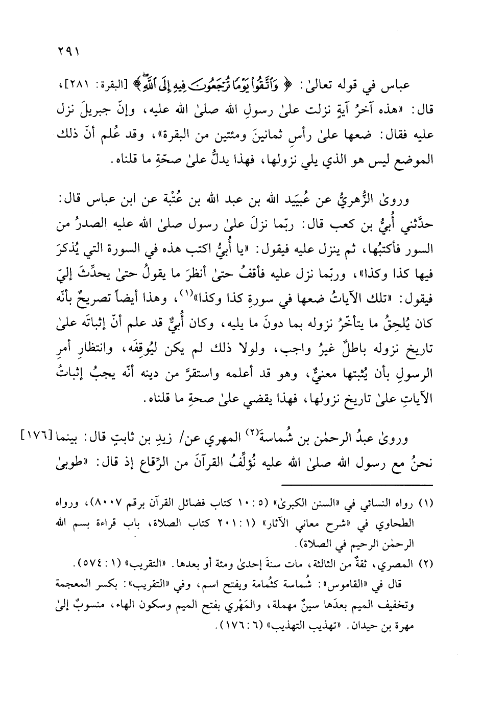 قال: "هذه آخرُ آيةٍ نزلت على رسولِ الله - صلى الله عليه وسلم - وإنّ جبريلَ نزل عليه فقال: ضعها على رأسِ ثمانينَ ومئتين من البقرة"، وقد عُلم أنّ ذلك الموضع ليس هو الذي يلي نزولها، فهذا يدلُّ على صحّةِ ما قلناه.