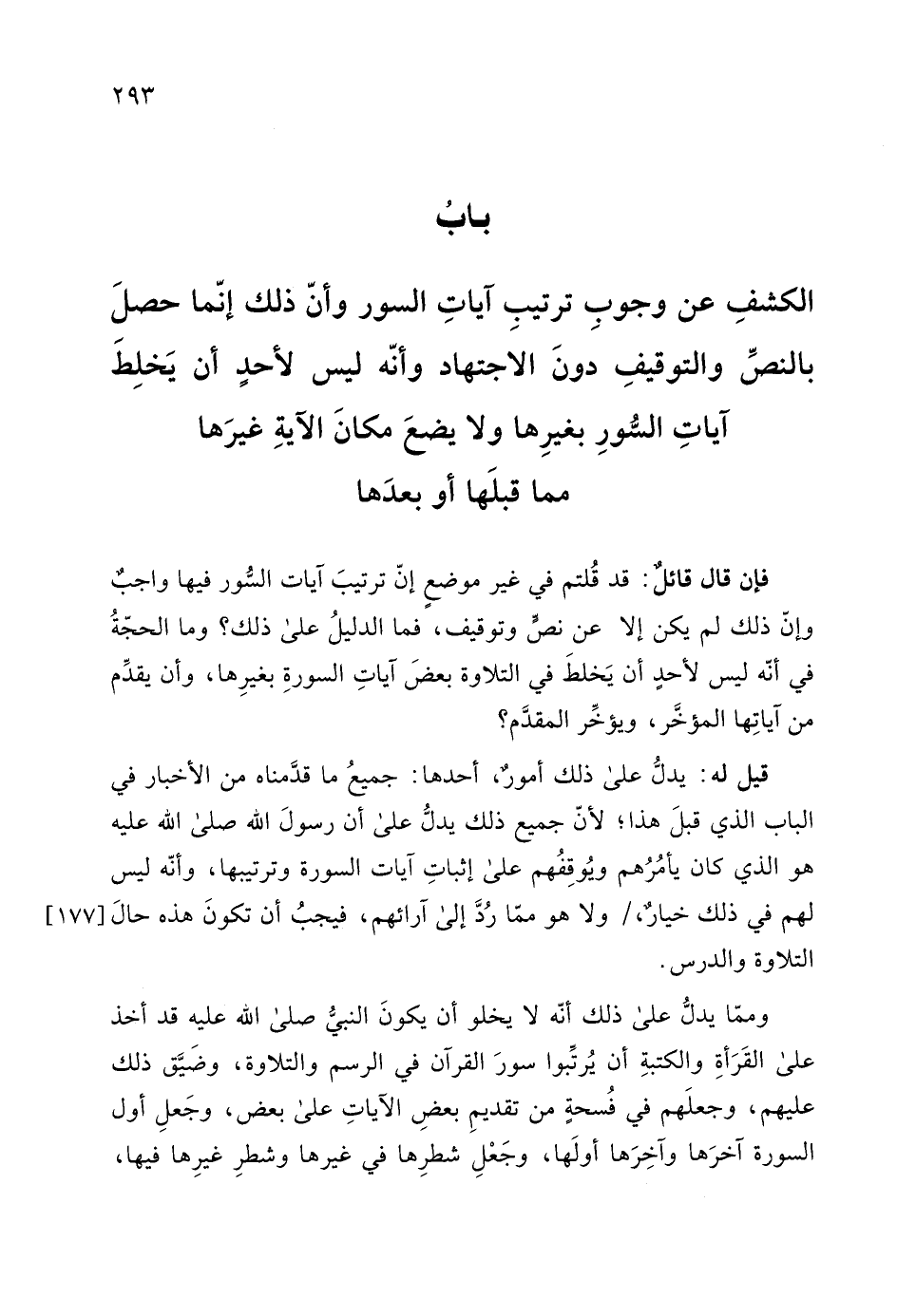 الباب الذي قبلَ هذا" لأنّ جميع ذلك يدلُّ على أن رسولَ الله - صلى الله عليه وسلم - هو الذي كان يأمُرُهم ويُوقِفُهم على إثباتِ آيات السورة وترتيبها، وأنّه ليس لهم في ذلك خيارٌ، ولا هو مما رُدَّ إلى آرائهم، فيجبُ أن تكونَ هذه حالَ التلاوة والدرس