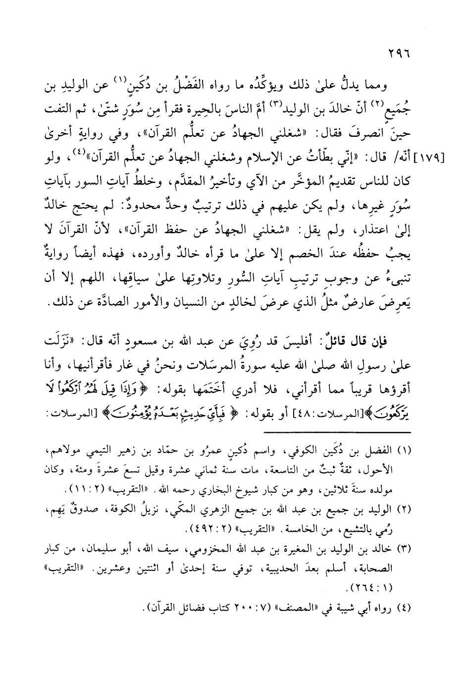 وفي روايةٍ أخرى أنّه قال: "إنّي بطّأتُ عن الإسلام وشغلني الجهادُ عن تعلُّم القرآن "، ولو كان للناس تقديمُ المؤخَّر من الآي وتأخيرُ المقدَّم، وخلطُ آياتِ السور بآياتِ سُوَرٍ غيرِها، ولم يكن عليهم في ذلك ترتيبٌ وحدٌّ محدودٌ: لم يحتج خالدٌ إلى اعتذار، ولم يقل: "شغلني الجهادُ عن حفظ القرآن "، لأنّ القرآنَ لا يجبُ حفظُه عندَ الخصم إلا على ما قرأه خالدٌ وأورده، فهذه أيضاً روايةٌ تنبىءُ عن وجوبِ ترتيبِ آياتِ السُّورِ وتلاوتها على سياقِها، اللهم إلا أن يَعرِضَ عارضٌ مثلُ الذي عرضَ لخالدٍ من النسيان والأمور الصادَّة عن ذلك.