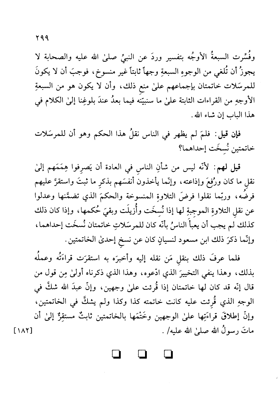 وفُسِّرت السبعةُ الأوجُه بتفسير وردَ عن النبيِّ - صلى الله عليه وسلم - والصحابة لا يجوزُ أن تُلغي من الوجوهِ السبعةِ وجها ثابتاً غير منسوخ، فوجبَ أن لا يكونَ للمرسَلات خاتمتان بإجماعهم على منعِ ذلك، وأن لا يكون هو من السبعةِ الأوجهِ من القراءات الثابتة على ما سنبيّنه فيما بعدُ عندَ بلوغِنا إلى الكلام في هذا الباب إن شاء الله.