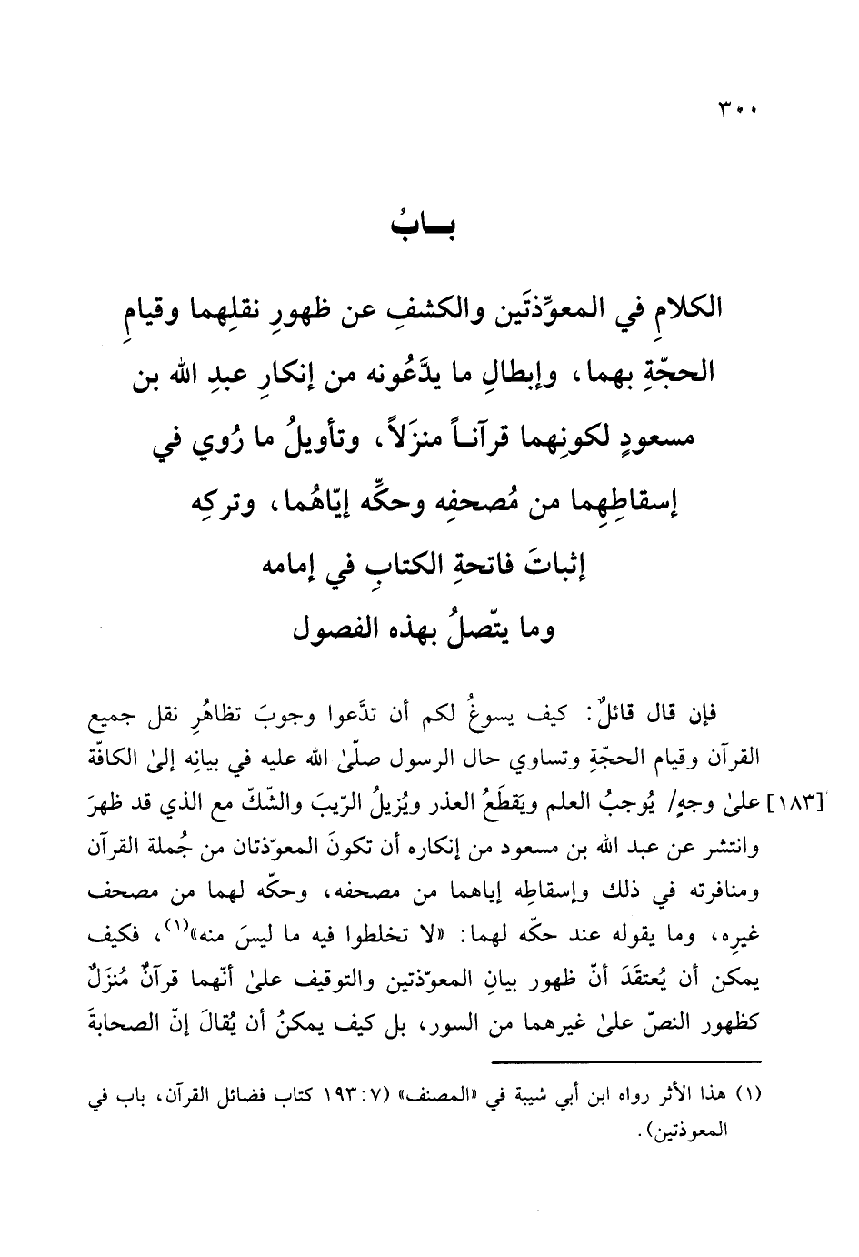 الكلامِ في المعوِّذتَين والكشفِ عن ظهورِ نقلِهما وقيامِ الحجةِ بهما، وإبطالِ ما يدَّعُونه من إنكارِ عبدِ الله بن مسعودٍ لكونِهما قرآناً منزَلاً، وتأويلُ ما رُوي في إسقاطِهِما من مُصحفِه وحكِّه إياهُما، وتركِه