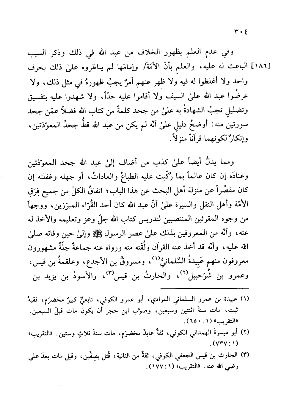 وتضليلٍ تجبُ الشهادةُ به على من جحد كلمةً من كتاب الله فضلاً عمن جحد سورتين منه: أوضحُ دليلٍ على أنه لم يكن من عبد الله قطُّ جحدُ المعوذتين، وإنكارٌ لكونهما قرآناً منزلاً.