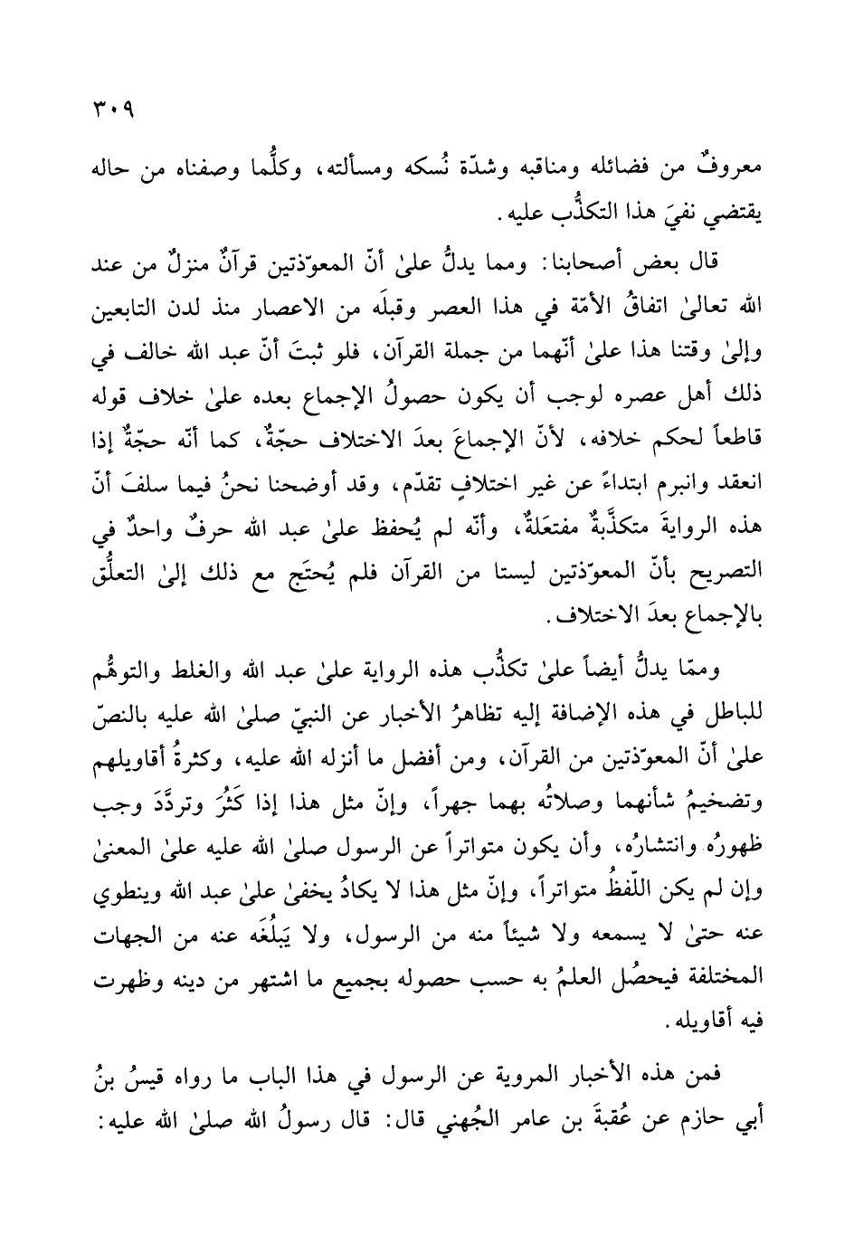 للباطل في هذه الإضافة إليه تظاهرُ الأخبار عن النبيّ - صلى الله عليه وسلم - بالنص على أنّ المعوذتين من القرآن، ومن أفضل ما أنزله الله عليه، وكثرةُ أقاويلهم وتضخيمُ شأنهما وصلاتُه بهما جهراً، وإن مثل هذا إذا كَثرُ وترددَ وجب ظهورُه وانتشارُه، وأن يكون متواتراً عن الرسول - صلى الله عليه وسلم - على المعنى وإن لم يكن اللّفظُ متواتراً، وإن مثل هذا لا يكادُ يخفى على عبد الله وينطوي عنه حتى لا يسمعه ولا شيئاً منه من الرسول، ولا يَبلُغَه عنه من الجهات المختلفة فيحصُل العلمُ به حسب حصوله بجميع ما اشتهر من دينه وظهرت فيه أقاويله.