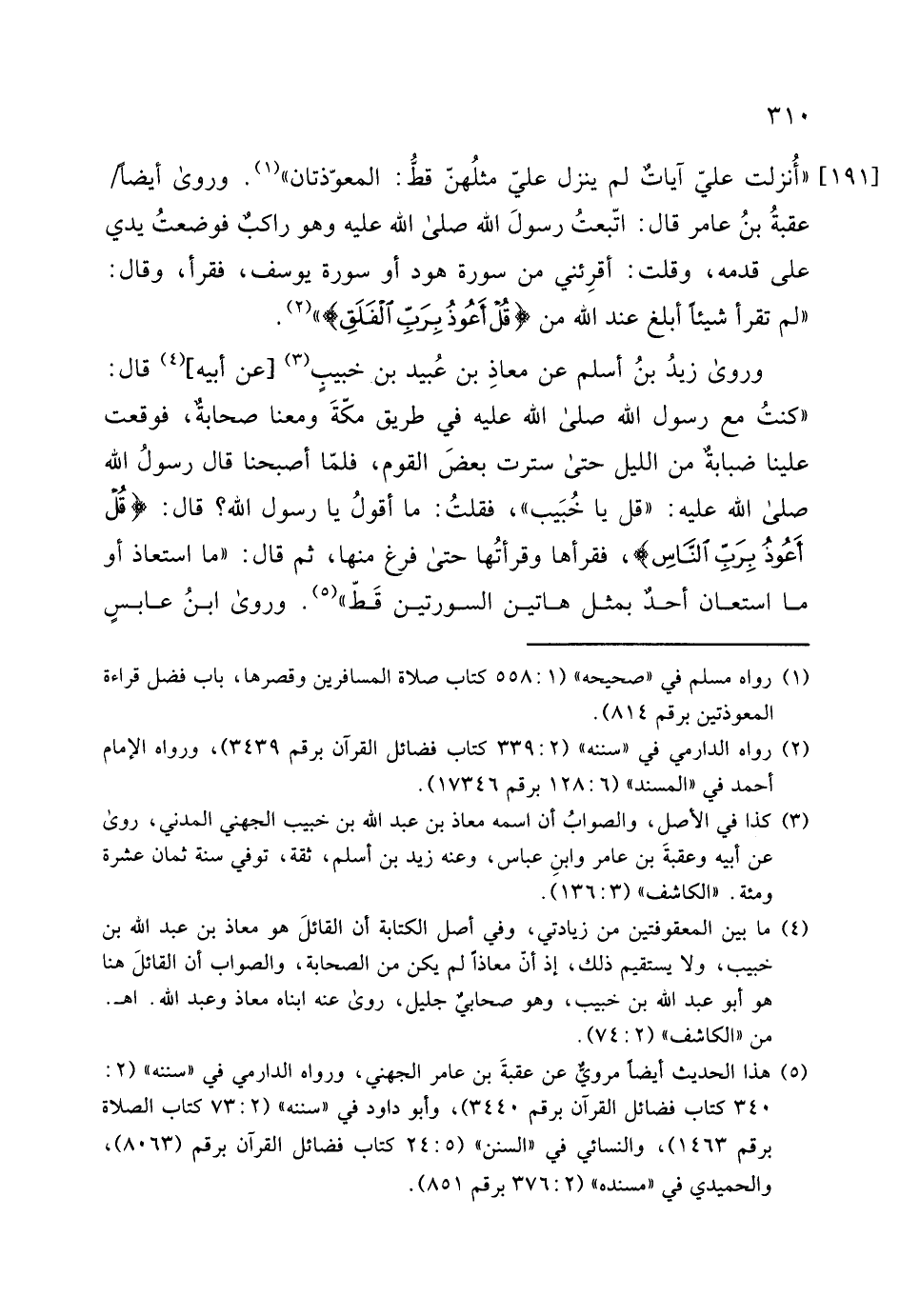 وروى أيضا عقبةُ بنُ عامر قال: اتّبعتُ رسولَ الله - صلى الله عليه وسلم - وهو راكبٌ فوضعتُ يدي على قدمه، وقلت: أقرِئني من سورة هود أو سورة يوسف، فقرأ، وقال: "لم تقرأ شيئا أبلغ عند الله من (قُل أَعُوذُ بِرَبِّ اَلفَلَقِ) .