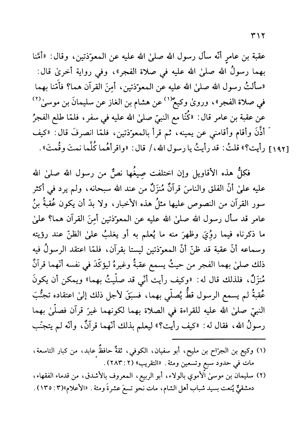 عامر قد سال رسول الله - صلى الله عليه وسلم - عن المعوذتين أمِنَ القرآن هما، على ما ذكرناه فيما روُيَ وظهرَ منه ما يُعلم به أو يغلبُ على الظنّ عند رؤيته وسماعه أن عقبة قد ظنّ أنّ المعوّذتين ليستا بقرآن، فلمّا اعتقد الرسولُ فيه ذلك صلى بهما الفجر من حيثُ يسمع عقبةُ وغيرهُ ليؤكّدَ في نفسه أنّهما قرآنٌ مُنزَلٌ، فلذلك قال له: "وكيف رأيت أني قد صلّيتُ بهما" ويمكن أن يكونَ عُقبةُ لم يسمع الرسول قط يُصلي بهما، فسبَقَ لأجل ذلك إلى اعتقاده تجنبَ النبيّ صلى الله عليه للقراءة في الصلاة بهما لكونهما غيرَ قرآن فصلّى بهما رسولُ الله، فقال له: "كيف رأيت، " ليعلم بذلك أنّهما قرآن، وأنّه لم يتجنّب