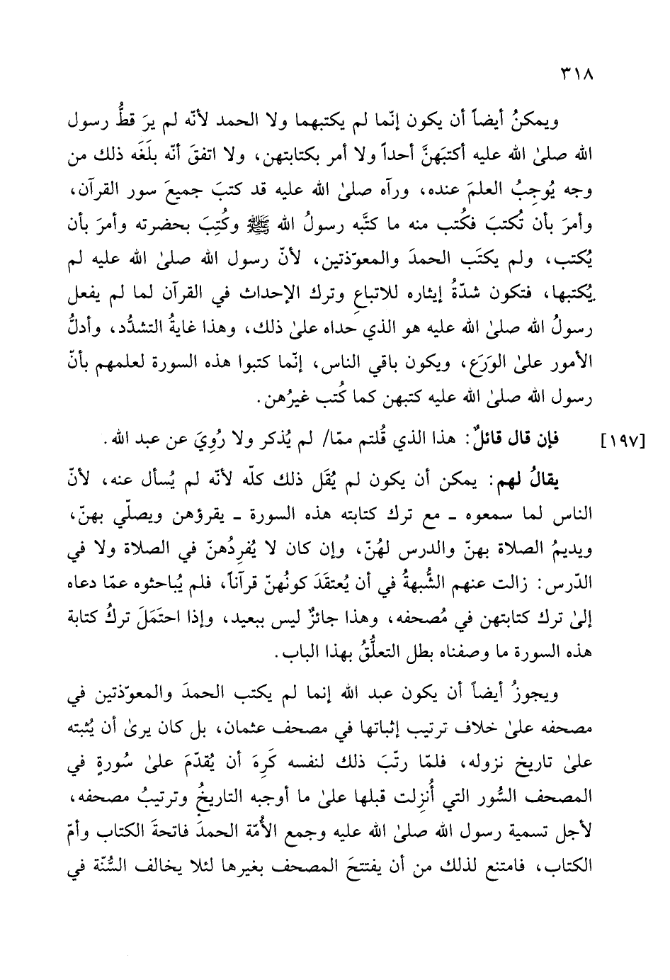 الله - صلى الله عليه وسلم - أكتبَهنَّ أحدا ولا أمر بكتابتهن، ولا اتفقَ أنّه بلَغَه ذلك من وجه يُوجِبُ العلمَ عنده، ورآه صلى الله عليه قد كتبَ جميعَ سور القرآن، وأمرَ بأن تكتبَ فكُتب منه ما كتَّبه رسولُ الله - صلى الله عليه وسلم - وكُتِبَ بحضرته وأمرَ بأن يُكتب، ولم يكتَب الحمدَ والمعوذتين، لأن رسول الله - صلى الله عليه وسلم - لم، يُكتبها، فتكون شدة ُ إيثاره للاتباعِ وترك الإحداث في القرآن لما لم يفعل رسولُ الله - صلى الله عليه وسلم - هو الذي حداه على ذلك، وهذا غايةُ التشدد.