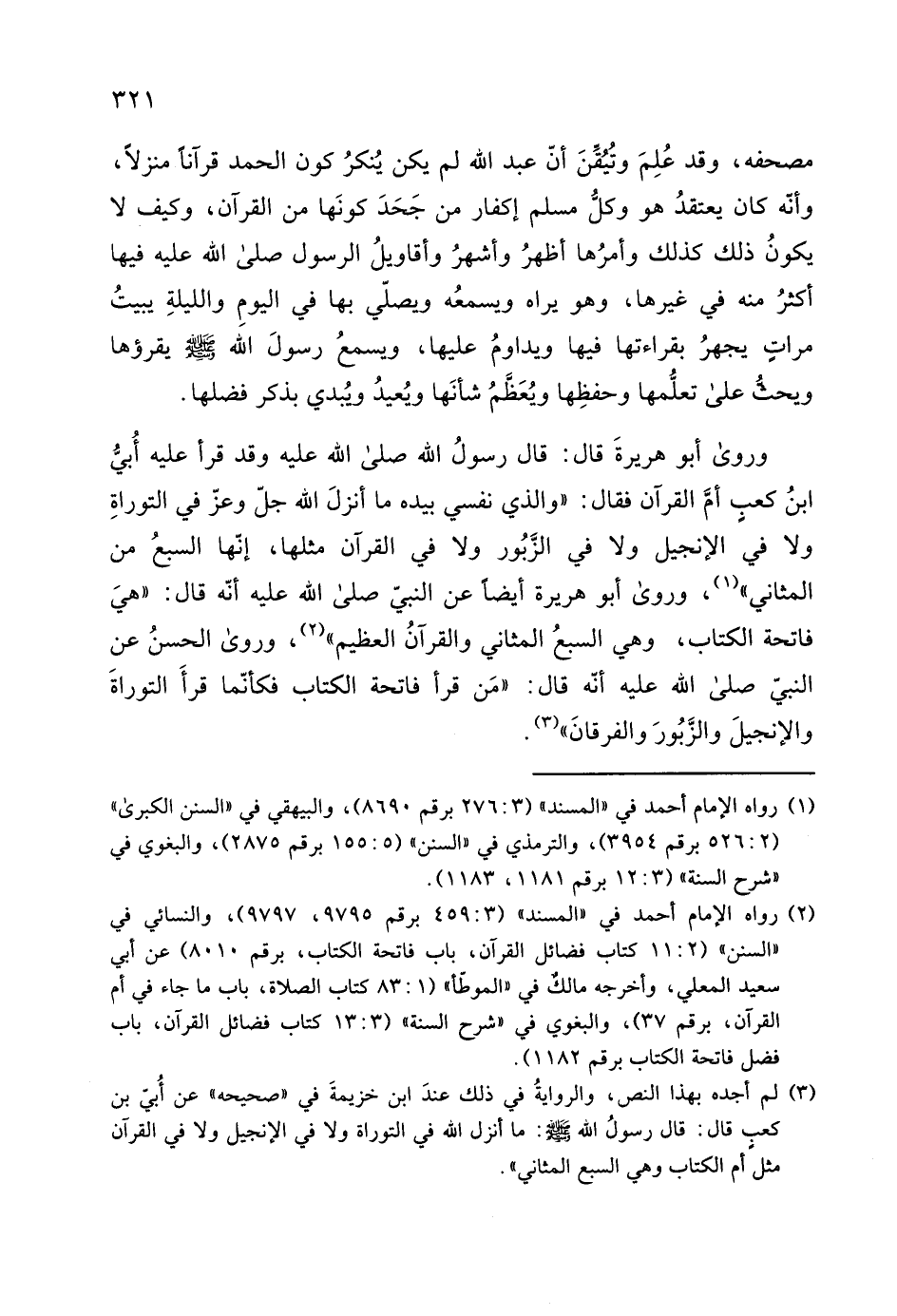 وروى أبو هريرةَ قال: قال رسولُ الله - صلى الله عليه وسلم - وقد قرأ عليه أُبيُّ ابنُ كعبٍ أمَّ القرآن فقال: "والذي نفسي بيده ما أنزلَ الله جلّ وعزّ في التوراةِ ولا في الإنجيل ولا في الزَبُور ولا في القرآن مثلها، إنها السبعُ من