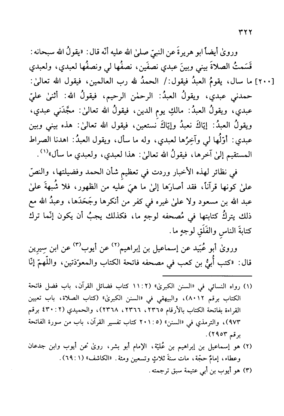 قال: "كتب أُبي بن كعب في مصحفه فاتحة الكتاب والمعوّذتين، واللهم إنّا