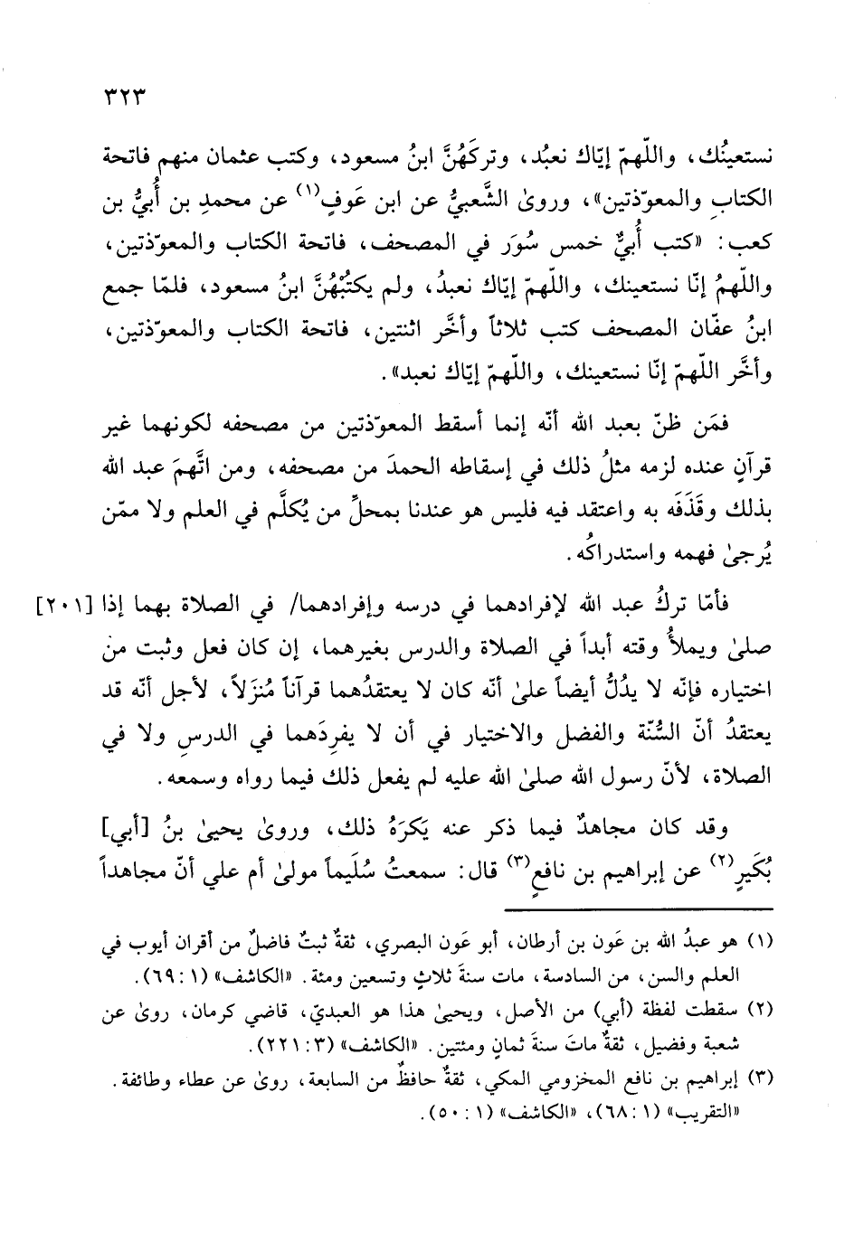 نستعينُك، واللهمّ إيّاك نعبُد، وتركَهُن ابنُ مسعود، وكتب عثمان منهم فاتحة الكتابِ والمعوّذتين ".