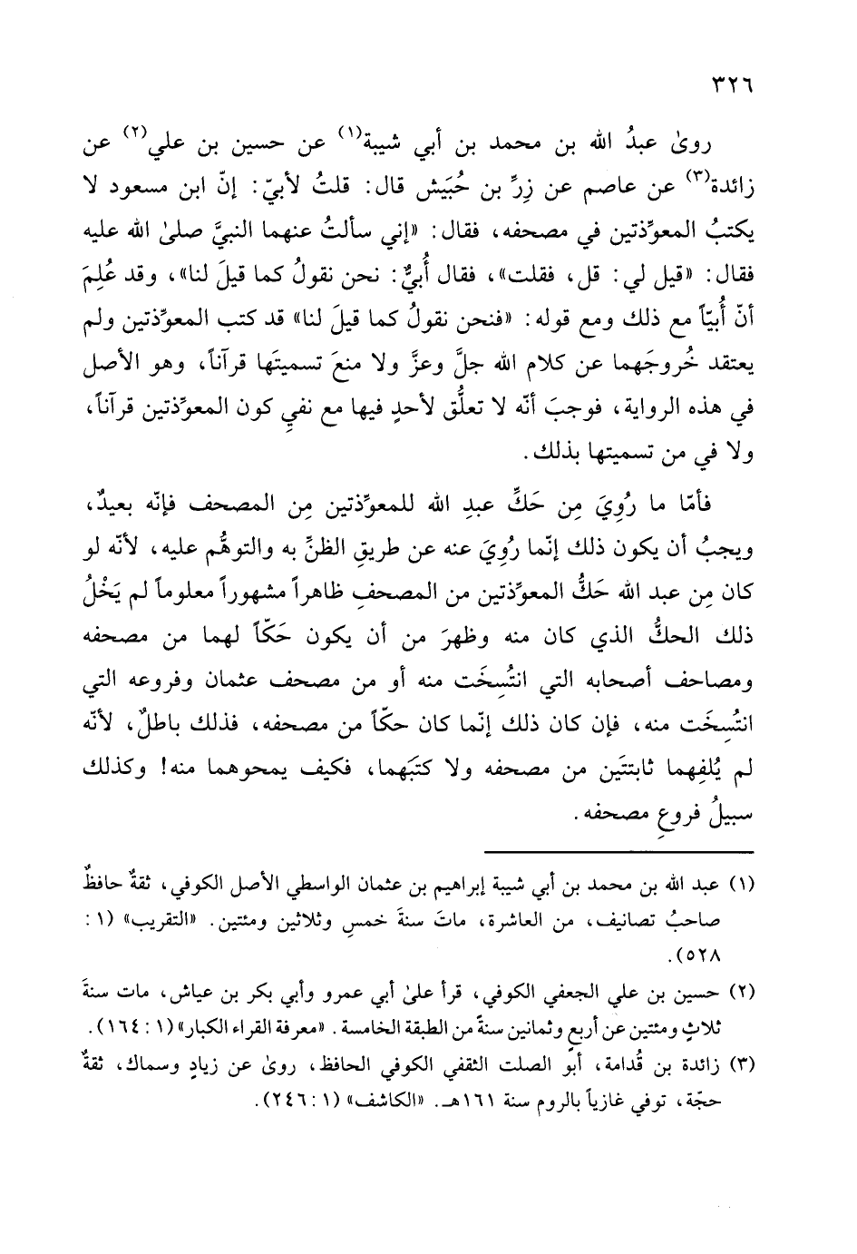 ويجبُ أن يكون ذلك إنّما رُوِيَ عنه عن طريقِ الظنِّ به والتوهم عليه، لأنه لو كان مِن عبد الله حَكُّ المعوذتين من المصحفِ ظاهرا مشهورا معلوماً لم يَخْلُ ذلك الحكُّ الذي كان منه وظهرَ من أن يكون حَكّا لهما من مصحفه