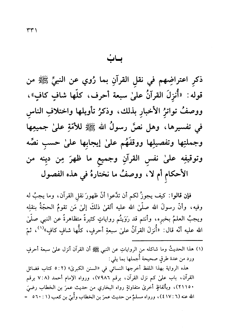 وفيه، وأنّ رسولَ الله - صلى الله عليه وسلم - ألقى ذلكَ إلى مَن تقومُ الحجّةُ بنقلِه ويجبُ العلمُ بخبرِه، وأنتم قد رَوَيتُم رواياتِ كثيرةَ متظاهرةَ عن النبي - صلى الله عليه وسلم - أنّه قال: "أُنزلَ القراَنُ على سبعةِ أحرفٍ، كلُّها شافٍ كافٍ "، ثمّ