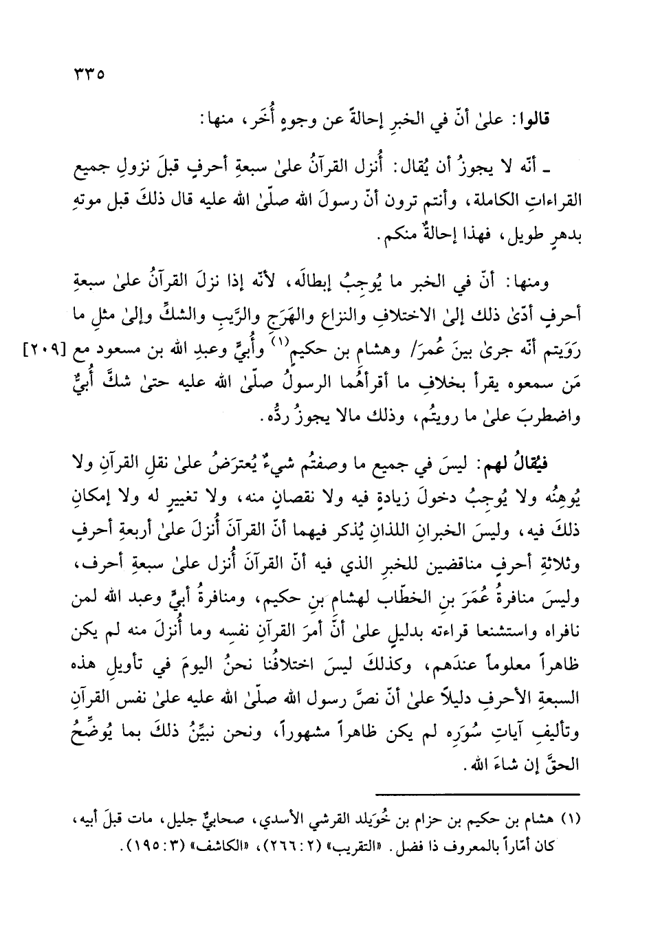 ذلكَ فيه، وليسَ الخبرانِ اللذانِ يُذكر فيهما أن القرآنَ أُنزلَ على أربعةِ أحرفٍ وثلاثةِ أحرفٍ مناقضين للخبرِ الذي فيه أن القرآنَ أُنزل على سبعةِ أحرف، وليسَ منافرةُ عُمَرَ بنِ الخطاب لهشامِ بنِ حكيم، ومنافرةُ أبي وعبد الله لمن نافراه واستشنعا قراءته بدليلٍ على أنّ أمرَ القرآنِ نفسِه وما أُنزلَ منه لم يكن ظاهراً معلوما عندَهم، وكذلكَ ليسَ اختلافُنا نحنُ اليومَ في تأويلِ هذه