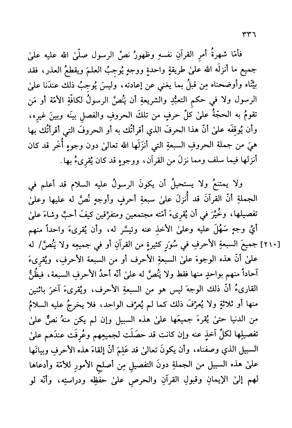 فأمّا شهرةُ أمرِ القرآنِ نفسهِ وظهورُ نصِّ الرسول - صلى الله عليه وسلم - على جميع ما أنزلَه الله على طريقةٍ واحدةٍ ووجهٍ يُوجِبُ العلمَ ويقطعُ العذر، فقد بيناه وأوضحناه مِن قبلُ بما يغني عن إعادته، وليسَ يُوجِبُ ذلك عندَنا على الرسول ولا في حكمِ التعبُّدِ والشريعةِ أن يَنُصَّ الرسولُ لكافةِ الأمَّة أو مَن تقومُ به الحجَّة ُ على كلِّ حرفٍ من تلكَ الحروفِ والفصلِ بينَه وبينَ غيرِه، وأن يُوقِفَه على أنّ هذا الحرفَ الذي أقرأتُك به أو الحروفَ التي أقرأتُك بها