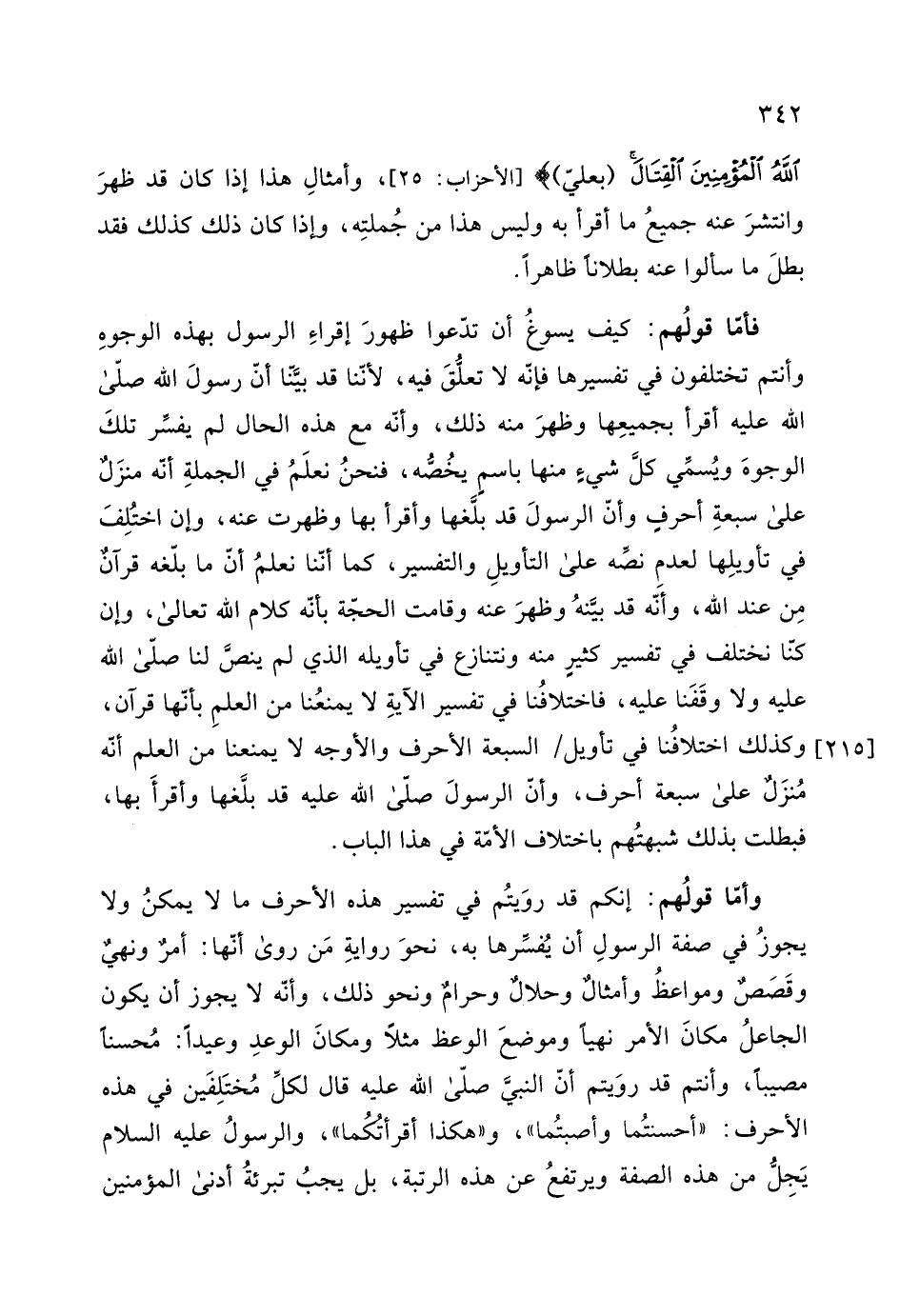 على سبعةِ أحرفٍ وأنّ الرسولَ قد بفلغها وأقرأ بها وظهرت عنه، وإن اختُلِفَ في تأويلِها لعدمِ نصِّه على التأويلِ والتفسير، كما أنّنا نعلمُ أن ما بلّغه قرآن مِن عند الله، وأنّه قد بينهُ وظهرَ عنه وقامت الحجّة بانّه كلام الله تعالى، وإن كنّا نختلف في تفسير كثيرٍ منه ونتنازع في تأويله الذي لم ينص لنا صلّى الله عليه ولا وقَفَنا عليه، فاختلافُنا في تفسير الآية ِ لا يمنعُنا من العلمِ بأنّها قرآن،، وكذلك اختلافُنا في تأويل السبعة الأحرف والأوجه لا يمنعنا من العلم أنّه مُنزَل على سبعة أحرف، وأنّ الرسولَ - صلى الله عليه وسلم - قد بلَّغها وأقرأَ بها، فبطلت بذلك شبهتُهم باختلاف الأمّة في هذا الباب.
