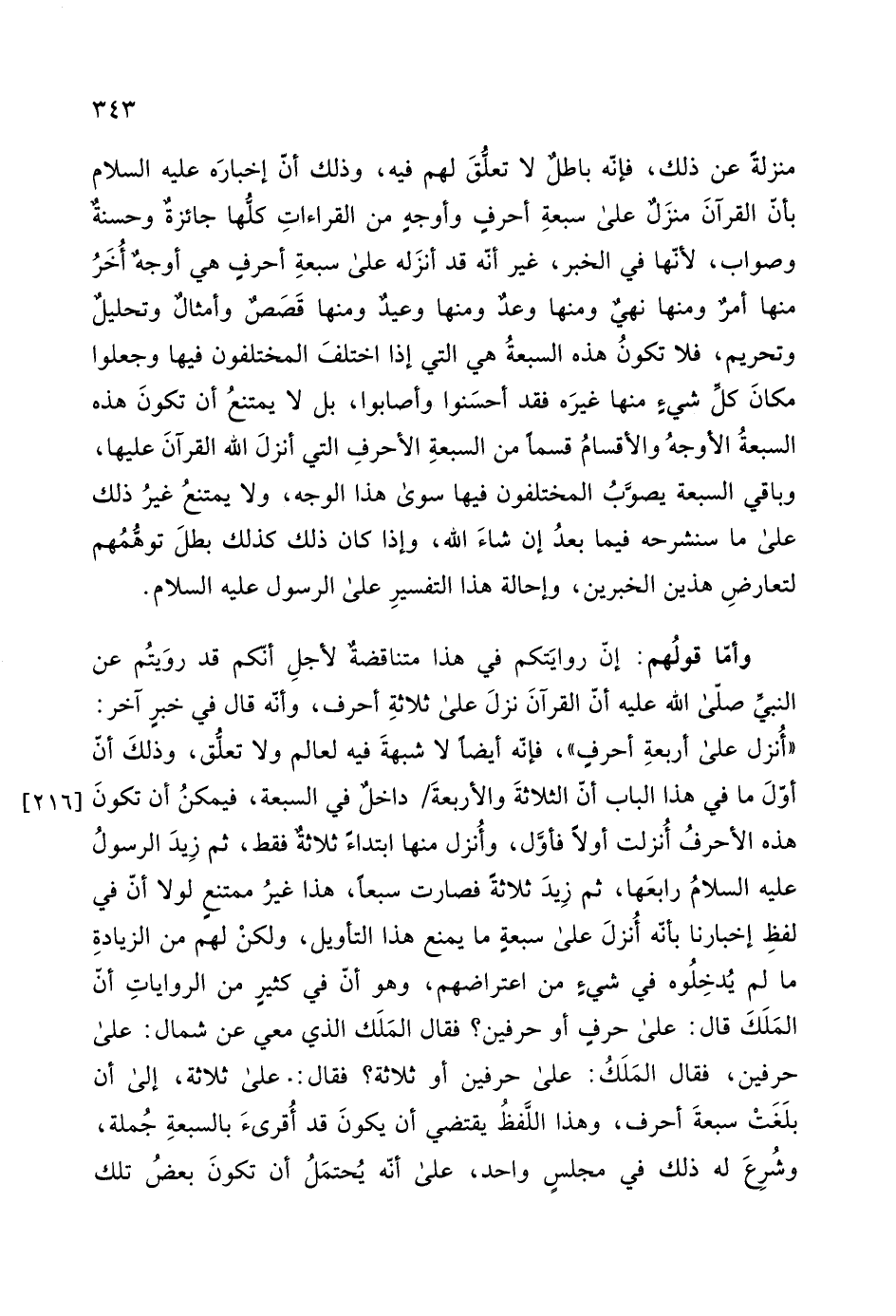 السبعةُ الأوجهُ والأقسامُ قسما من السبعةِ الأحرفِ التي أنزلَ الله القرآنَ عليها، وباقي السبعة يصوبُ المختلفون فيها سوى هذا الوجه، ولا يمتنعُ غيرُ ذلك على ما سنشرحه فيما بعدُ إن شاءَ الله، وإذا كان ذلك كذلك بطلَ توهُّمُهم لتعارضِ هذين الخبرين، وإحالة هذا التفسيرِ على الرسول عليه السلام.