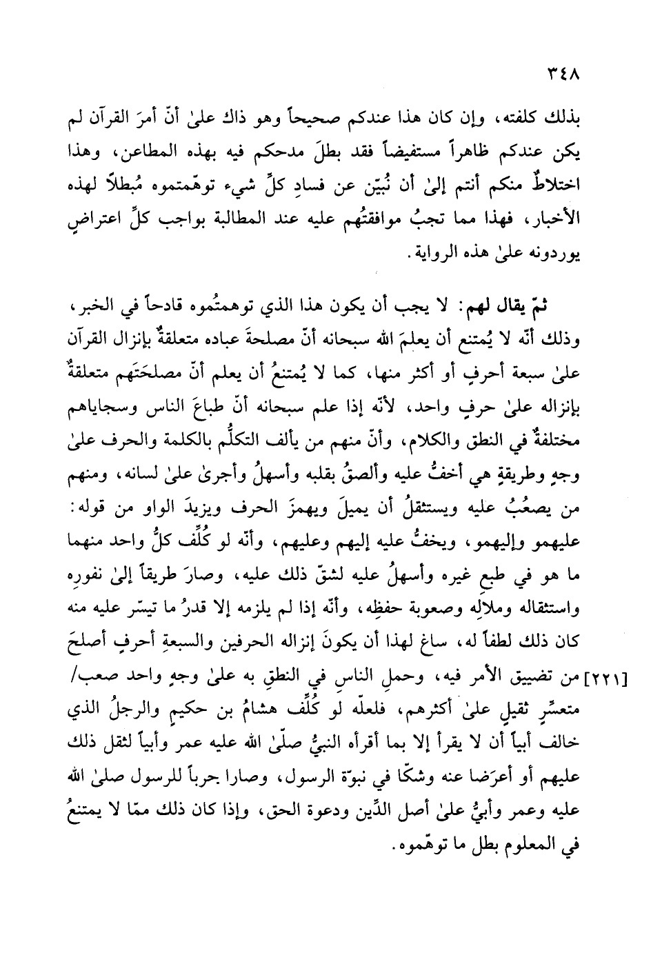 وذلك أنّه لا يُمتنع أن يعلمَ الله سبحانه أنّ مصلحةَ عباده متعلقة بإنزال القرآن على سبعة أحرفٍ أو أكثر منها، كما لا يُمتنعُ أن يعلم أن مصلحَتَهم متعلقةٌ بإنزاله على حرفِ واحد، لأنه إذا علم سبحانه أنّ طباعَ الناس وسجاياهم