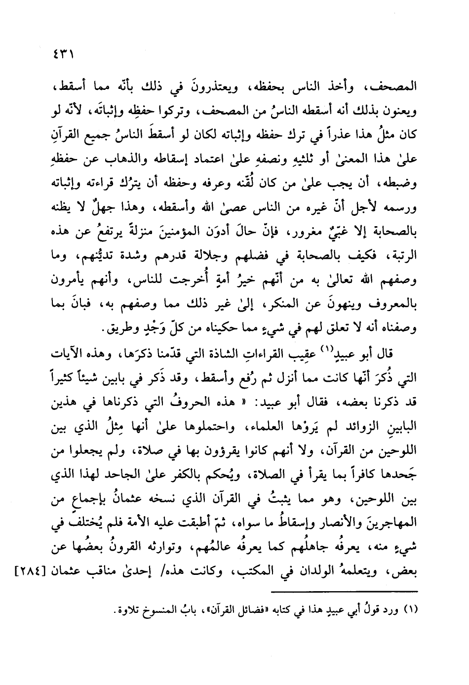 المصحف، وأخذ الناس بحفظه، ويعتذرونَ في ذلك بأنه مما أسقط.