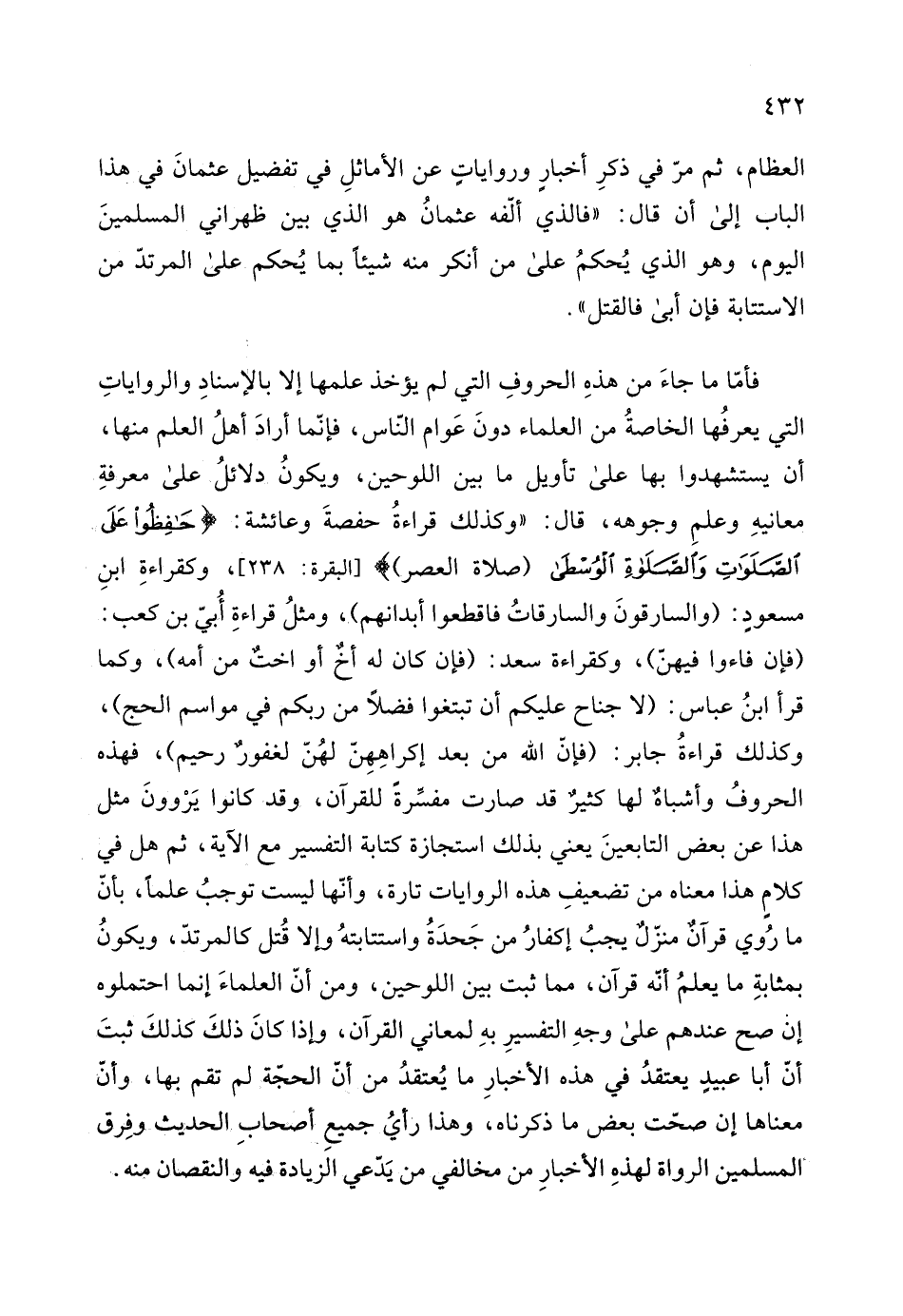 كلامٍ هذا معناه من تضعيفِ هذه الروايات تارة، وأنها ليست توجبُ علماً، بأن ما رُوي قرآن منزل يجبُ إكفارُ من جَحدَةُ واستتابتهُ وإلا قُتل كالمرتد، ويكونُ بمثابةِ ما يعلمُ أنه قرآن، مما ثبت بين اللوحين، ومن أن العلماءَ إنما احتملوه إن صح عندهم على وجهِ التفسيرِ بهِ لمعاني القرآن، وإذا كانَ ذلكَ كذلكَ ثبتَ أنّ أبا عبيدِ يعتقدُ في هذه الأخبارِ ما يُعتقدُ من أنّ الحجَّة لم تقم بها، وأن معناها إن صحَّت بعض ما ذكرناه، وهذا رأيُ جميعِ أصحابِ الحديث وفِرق المسلمين الرواة لهذهِ الأخبارِ من مخالفي من يَدّعي الزيادة - فيه والنقصان منه.