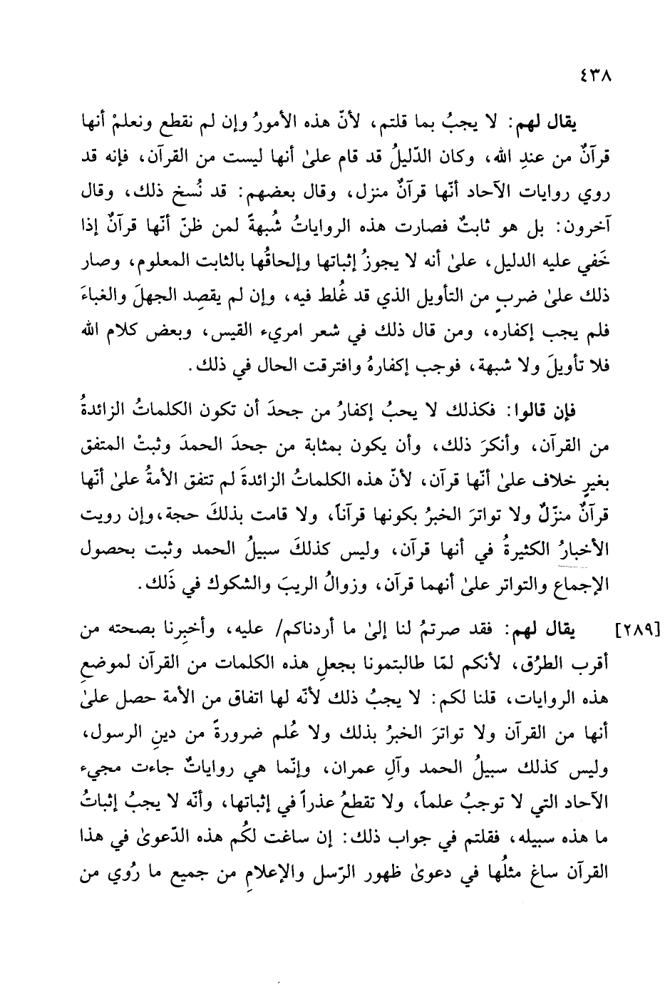 فإن قالوا: فكذلك لا يحبُ إكفارُ من جحدَ أن تكون الكلماتُ الزائدةُ