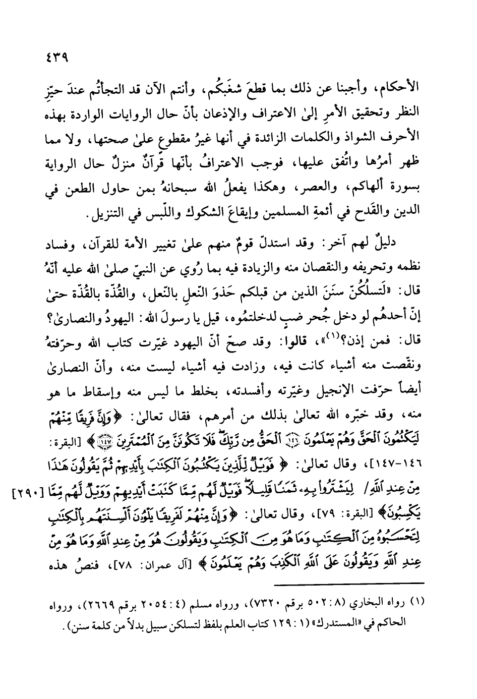 قالوا: وقد صح أن اليهود غيرت كتاب الله وحرفتهُ ونقصت منه أشياء كانت فيه، وزادت فيه أشياء ليست منه، وأن النصارى