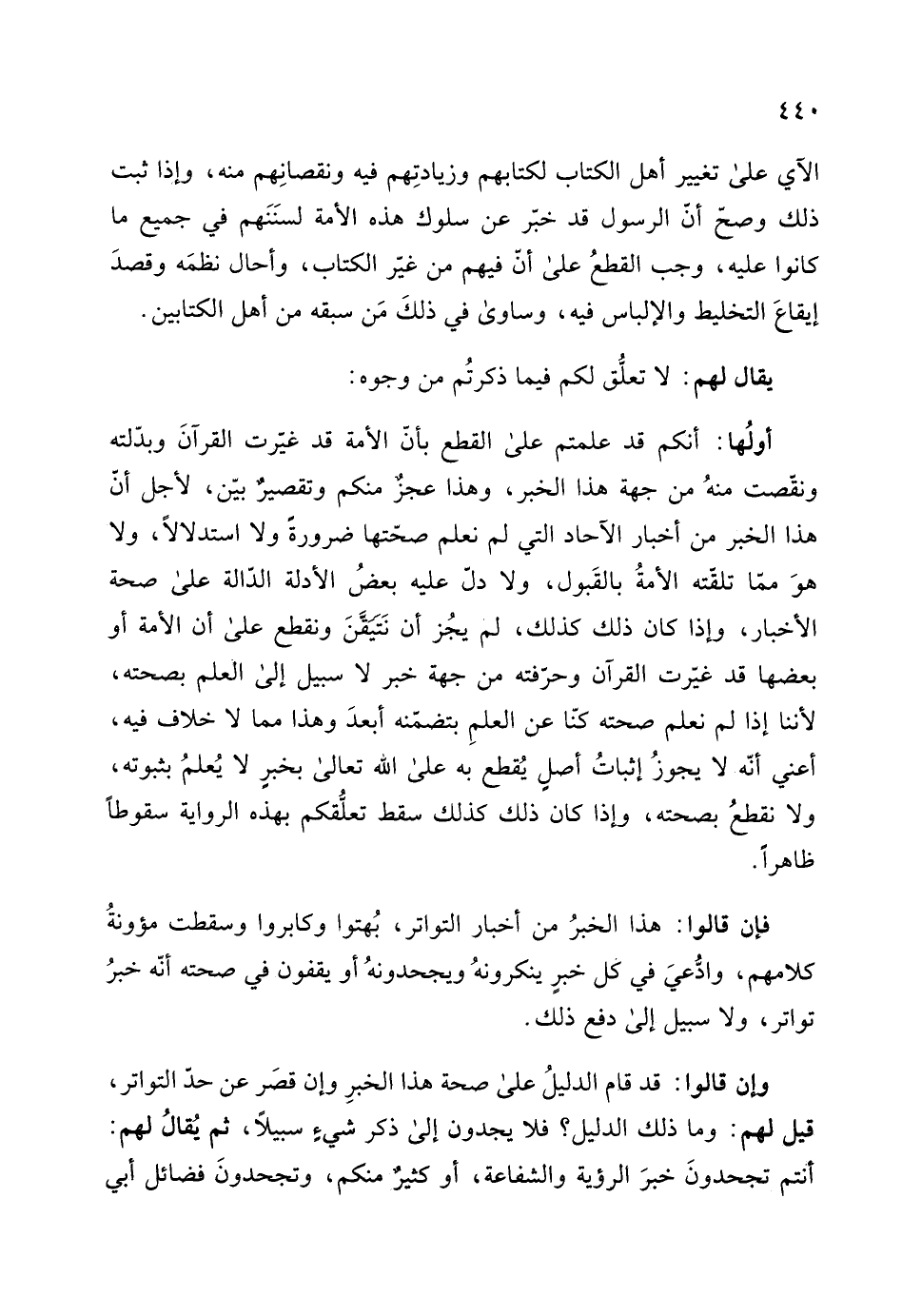 أولُها: أنكم قد علمتم على القطع بأن الأمة قد غيّرت القرآنَ وبدّلته