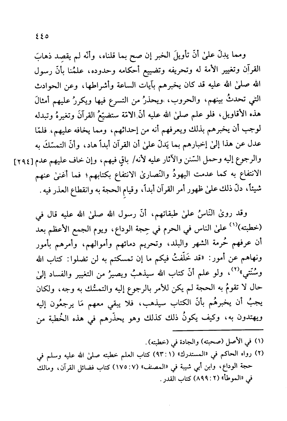 الله - صلى الله عليه وسلم -، قد كان يخبرهم بآيات الساعة وأشراطها، وعن الحوادث التي تحدثُ بينهم، والحروب،، ويحذرُ من التسرع فيها ويكررُ عليهم أمثالَ هذه الأقاويل، فلو علم صلى الله عليه أنّ الأمة ستضيعُ القرآنَ وتغيرهُ وتبدله لوجب أن يخبرهم بذلك ويعرفهم أنه من إحداثهم، ومما يخافه عليهم، فلمّا عدل عن هذا إلى إخبارهم بما يَدل على أن القرآن أبداً هاد، وأن التمسّكَ به والرجوع إليه وحمل السّنن والآثار عليه لأنه باقٍ فيهم، وإن خاف عليهم عدم الانتفاع به كما عدمت اليهودُ والنّصارى الانتفاع بكتابهم، فما أغنى عنهم شيئا، دل ذلك على ظهور أمر القرآن أبدا، وقيامِ الحجة به وانقطاع العذر فيه.