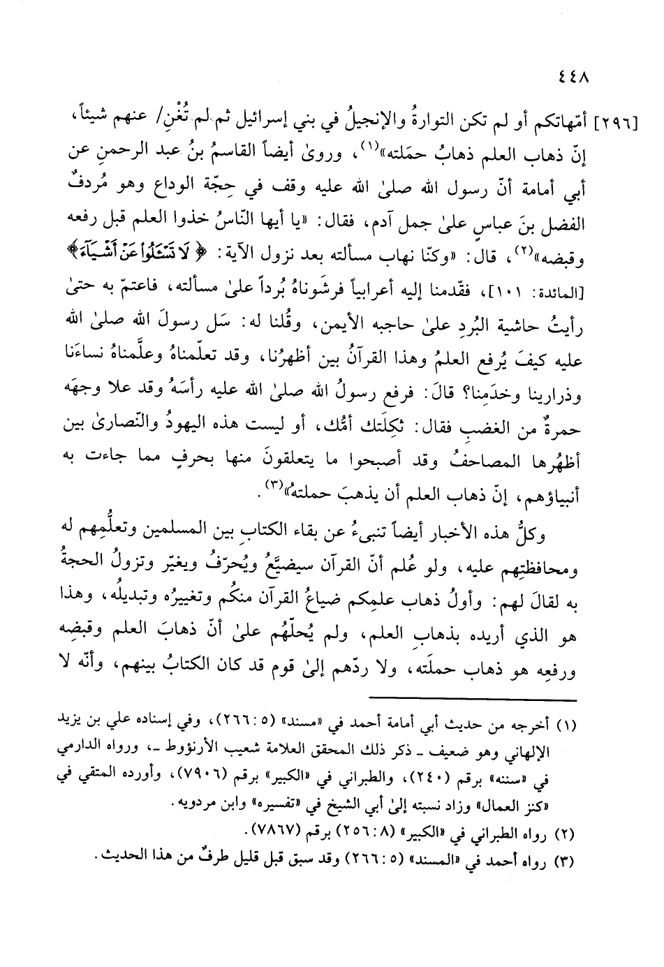 ثكلتكُم أمهاتكم أو لم تكن التوارةُ والإنجيلُ في بني إسرائيل ثم لم تُغْنِ عنهم شيئاً، إن ذهاب العلم ذهابُ حمَلته ".