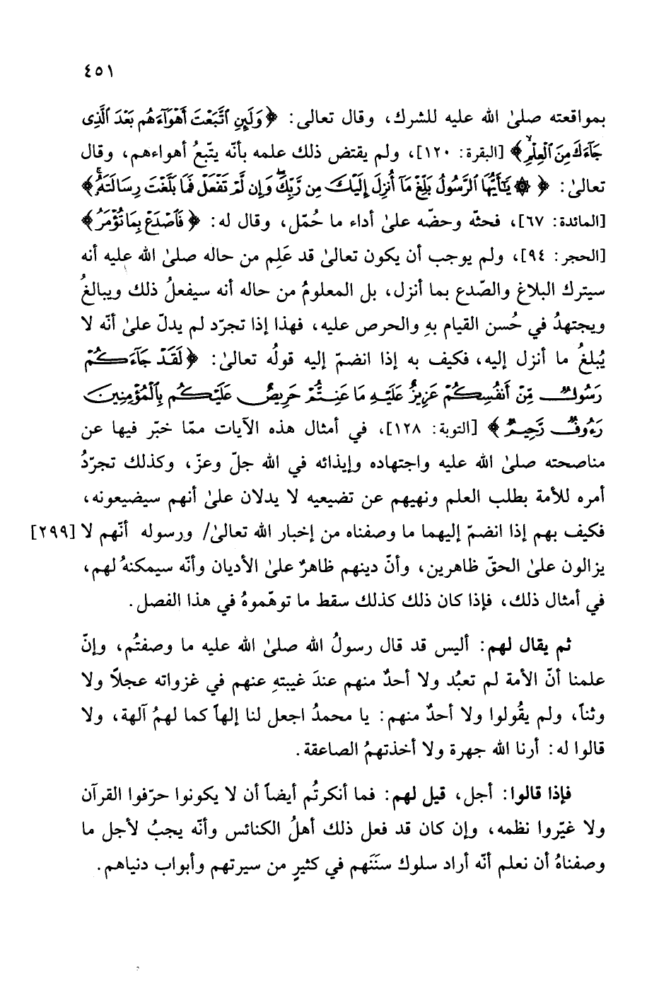 بمواقعته صلى الله عليه للشرك، وقال تعالى: (وَلَئِنِ اتَّبَعْتَ أَهْوَاءَهُمْ بَعْدَ الَّذِي جَاءَكَ مِنَ الْعِلْمِ) ، ولم يقتض ذلك علمه بأنه يتبعُ أهواءهم، وقال