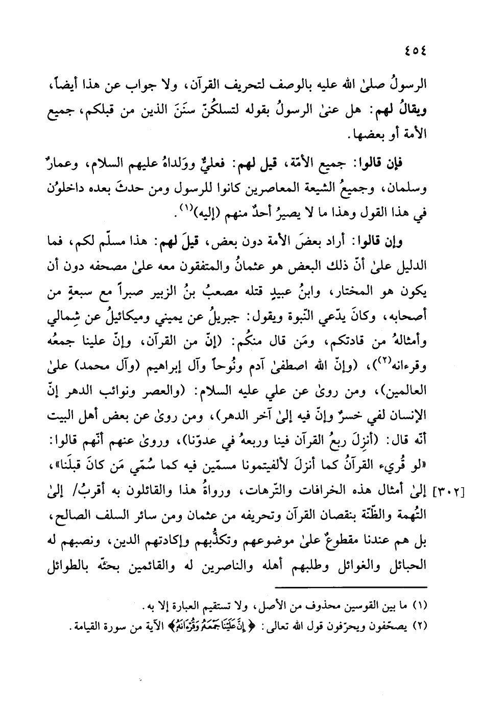 الرسولُ صلى الله عليه بالوصف لتحريف القرآن، ولا جواب عن هذا أيضا، ويقالُ لهم: هل عنى الرسولُ بقوله "لتسلكُن سنَنَ الذين من قبلكم"، جميع