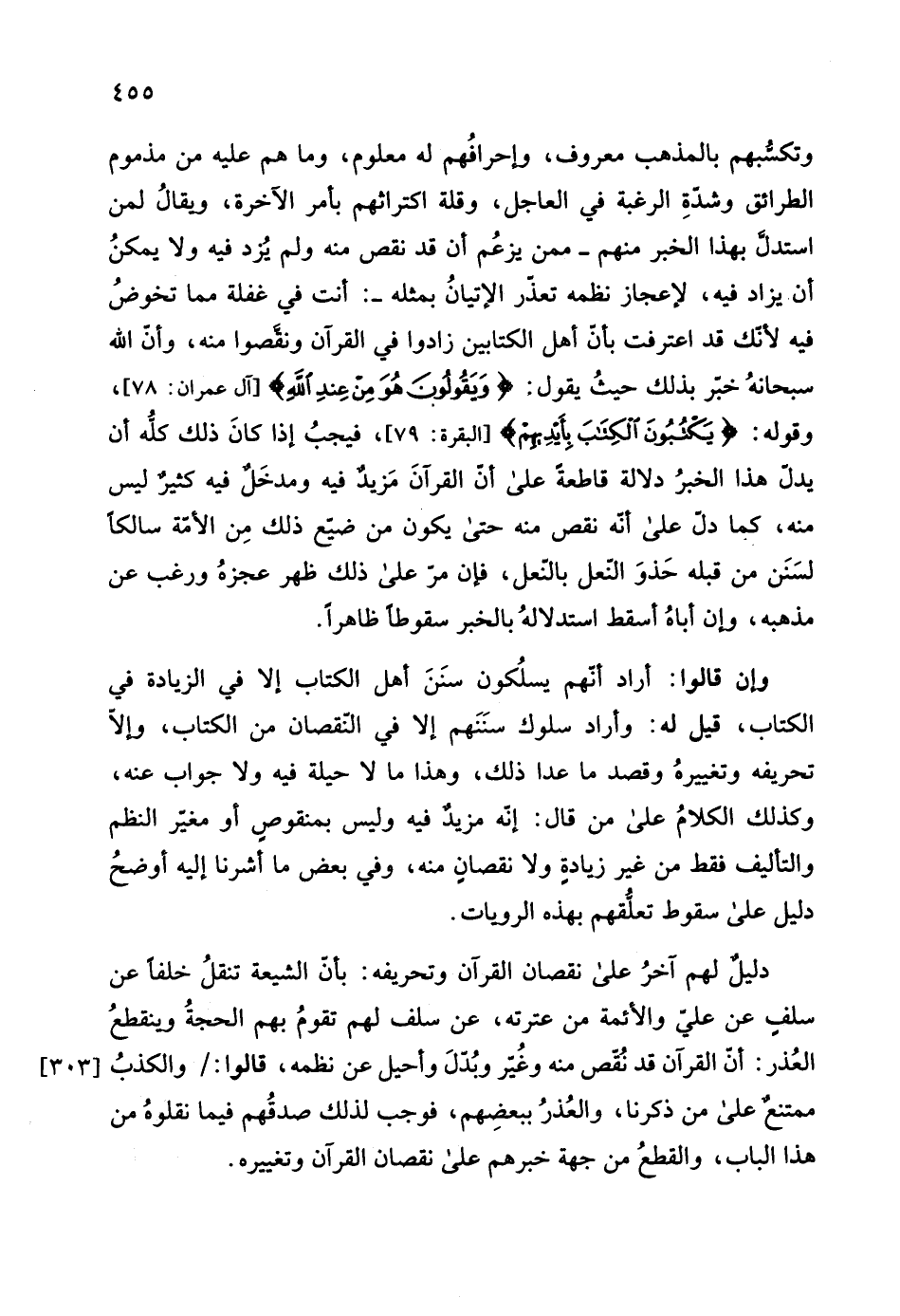 فيه لأنك قد اعترفت بأن أهل الكتابين زادوا في القرآن ونقصوا منه، وأن الله سبحانهُ خبَّر بذلك حيثُ يقول: (وَيَقُولون هُوَ مِن عِندِ اللهِ) .